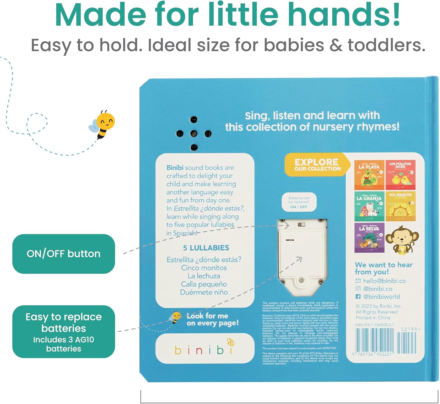 - ๐๐๐ฟ๐ฎ๐ฏ๐น๐ฒ & ๐ ๐ฎ๐ฑ๐ฒ ๐๐ผ๐ฟ ๐๐ถ๐๐๐น๐ฒ ๐๐ฎ๐ป๐ฑ๐. Binibi bilingual English-Spanish books for babies & toddlers 1-3 are durable and feature hard covers, thick pages and rounded corners - they are made for little hands and are easy to clean! All musical Spanish nursery rhyme books feature an on/off button for extended battery life, and easily replaceable batteries. 3 AG10 batteries in every book.