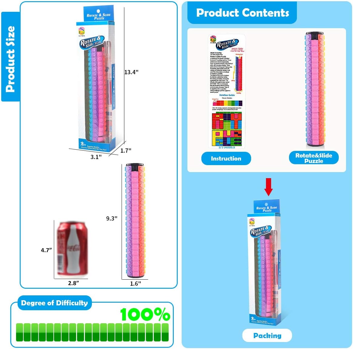 - 【 Uses 】Unlike other brain games,the patented,critically acclaimed cube puzzle is a unique toy and unique gift,it is a combination of rotating magic cube and slide puzzle,each puzzle piece can be rotated from up and down with a whole column around the axis as well as be slided left and right on a row