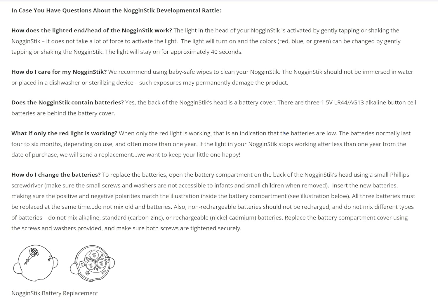 - FAQ's: The NogginStik isn't designed to constantly stay on. It will turn on for about 40 seconds at a time when gently shaken or tapped. It will turn off after a period of inactivity. Please refer to product "FAQ" picture on the detail page for common questions related to the use and care of your NogginStik.