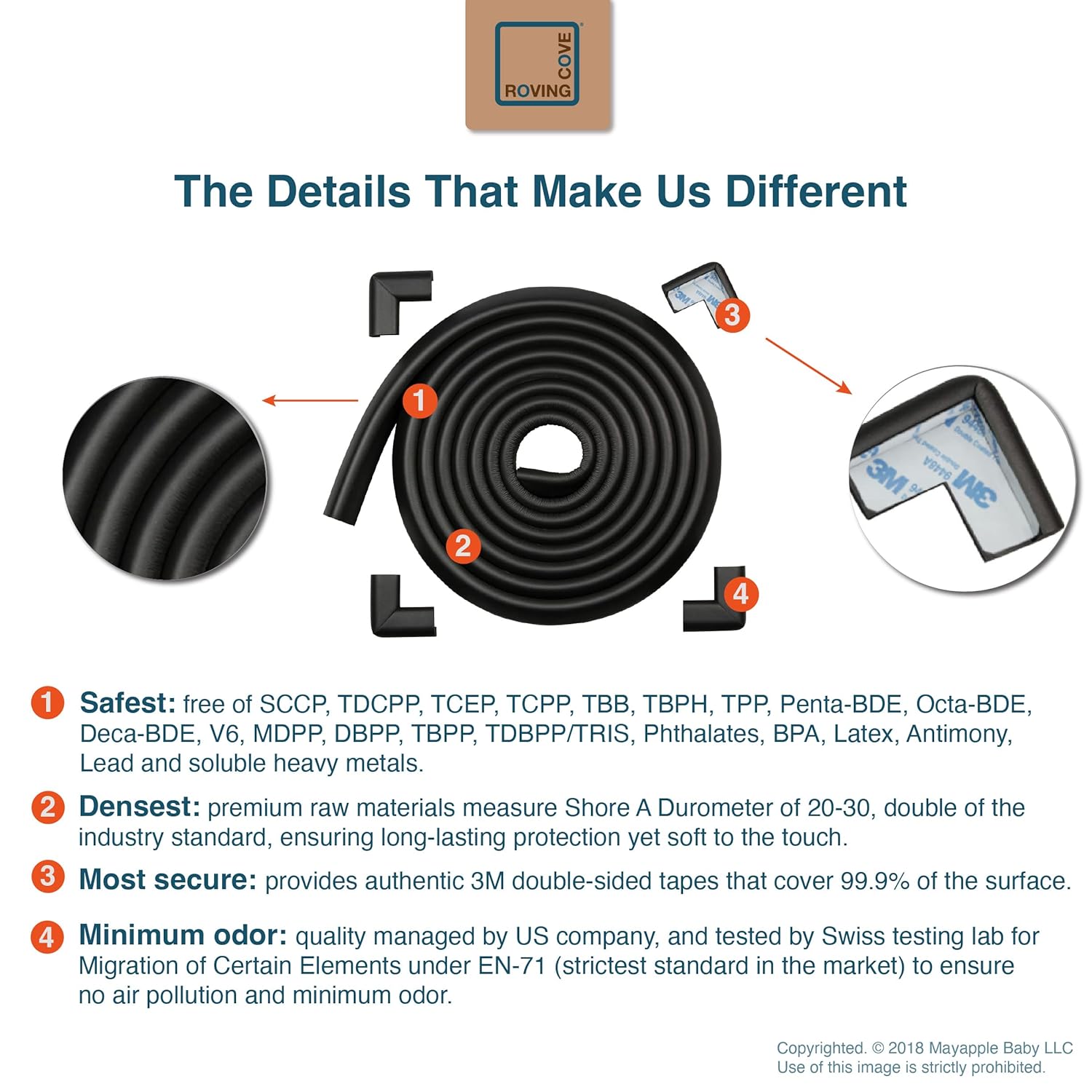- CLEAN SAFETY: Roving Cove uses safe and pure raw material and was the first brand to make foam safety bumpers without the use of toxic flame-retardant chemicals (SCCPs). Our edge corner guards contain no BPA, no phthalates, no heavy metals, no latex, no SCCPs. Inherently flame-resistant; passed flammability tests under US regulations.