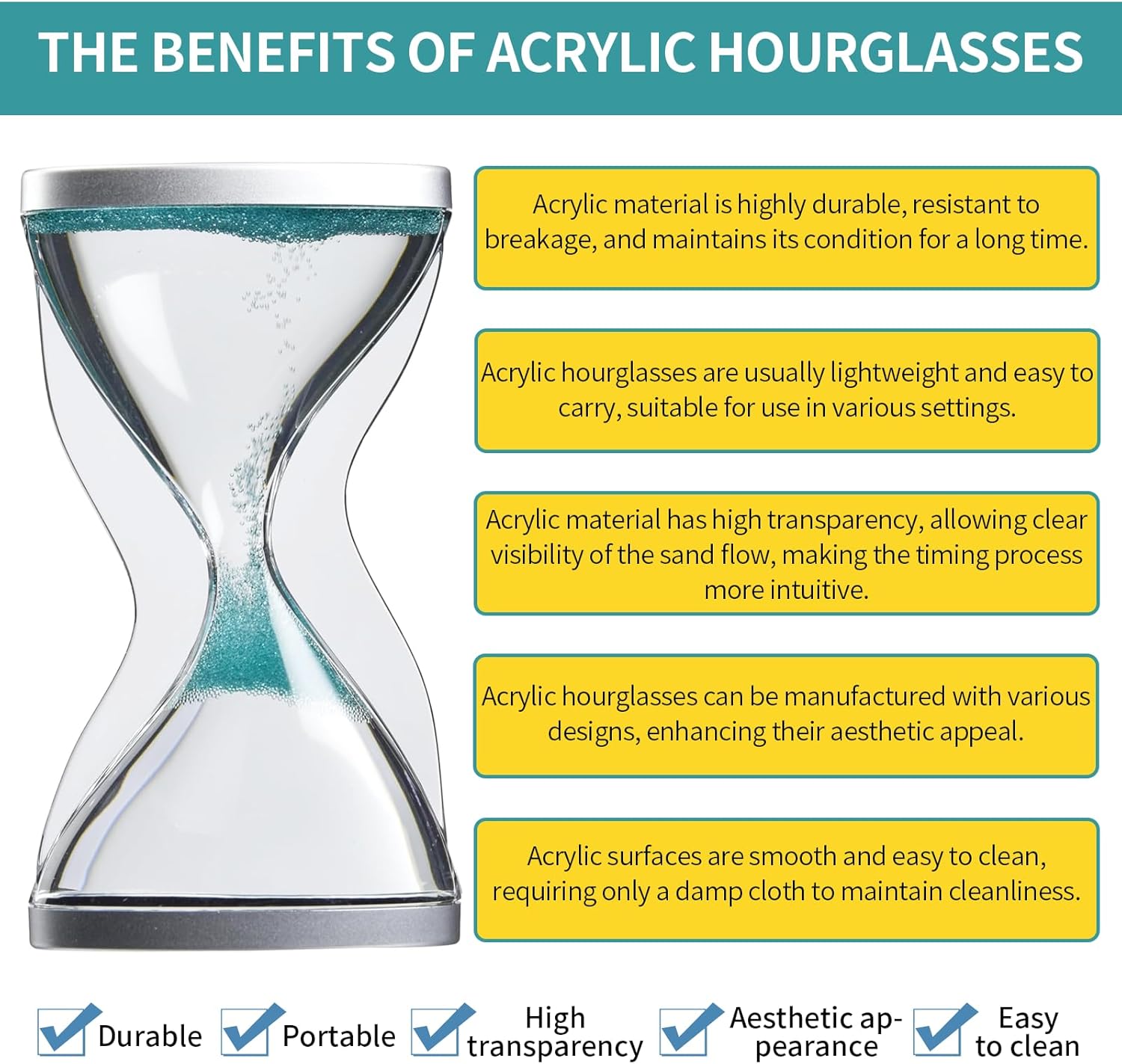 - 【Best time management method】The hour glasses with sand 10 minutes help your kids do things more efficiently and develop a strong sense of time. The hourglass timer 10 minute can be used for cooking, games, classroom, study, desk office decorative and teachers use