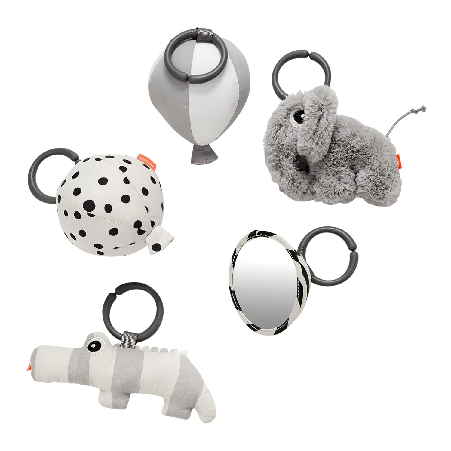 - let your baby enjoy crinkle, rattle and chime sounds - Croco will crinkle when touched, while Elphee rattles. The balloons contain a chime and a bell, and there's even a fun mirror included