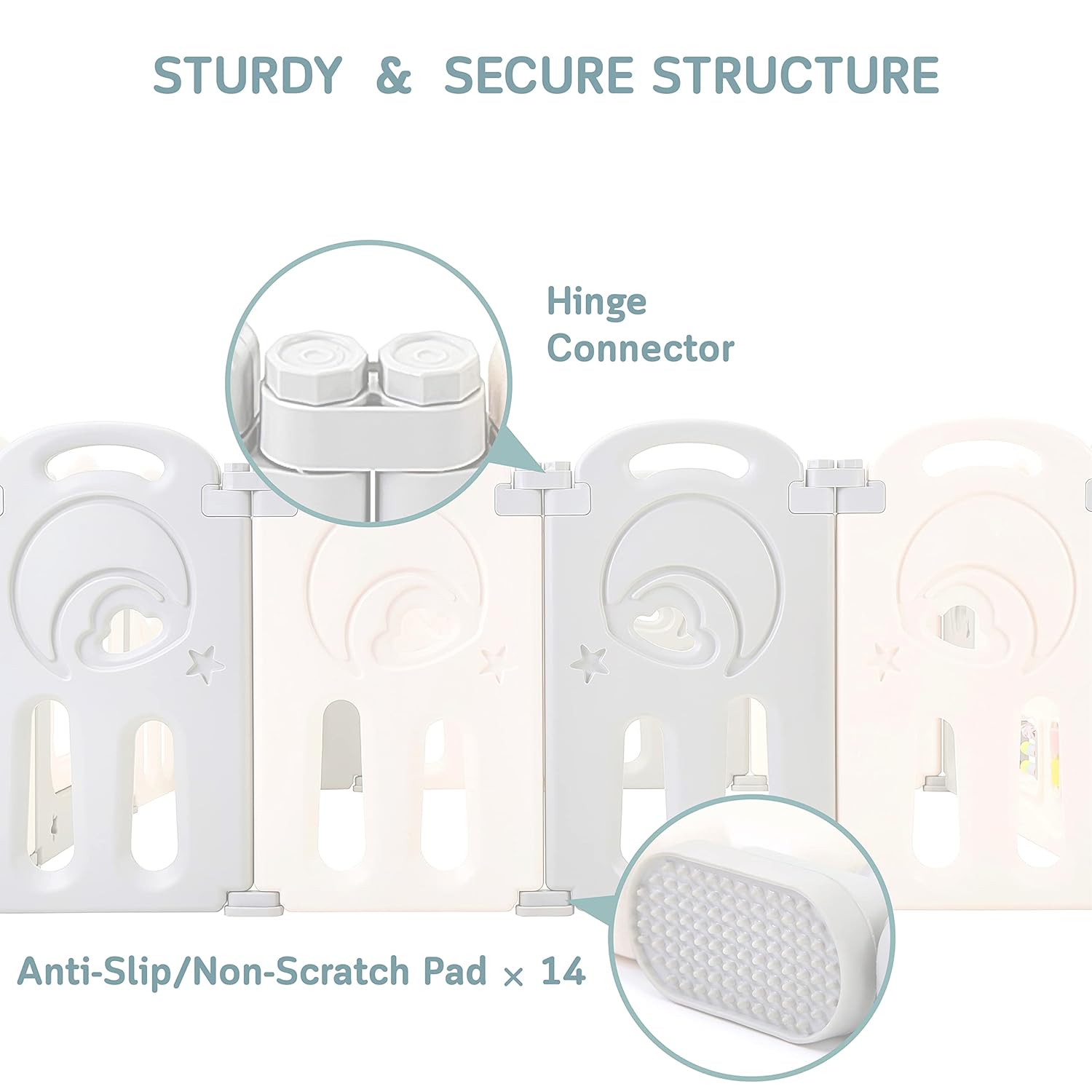 - STURDY & SECURE: Keeps the baby fence's shape and position thanks to its strong hinge connectors and anti-slip pads; includes a gate with safety lock that allows convenient access and secures your baby inside.
