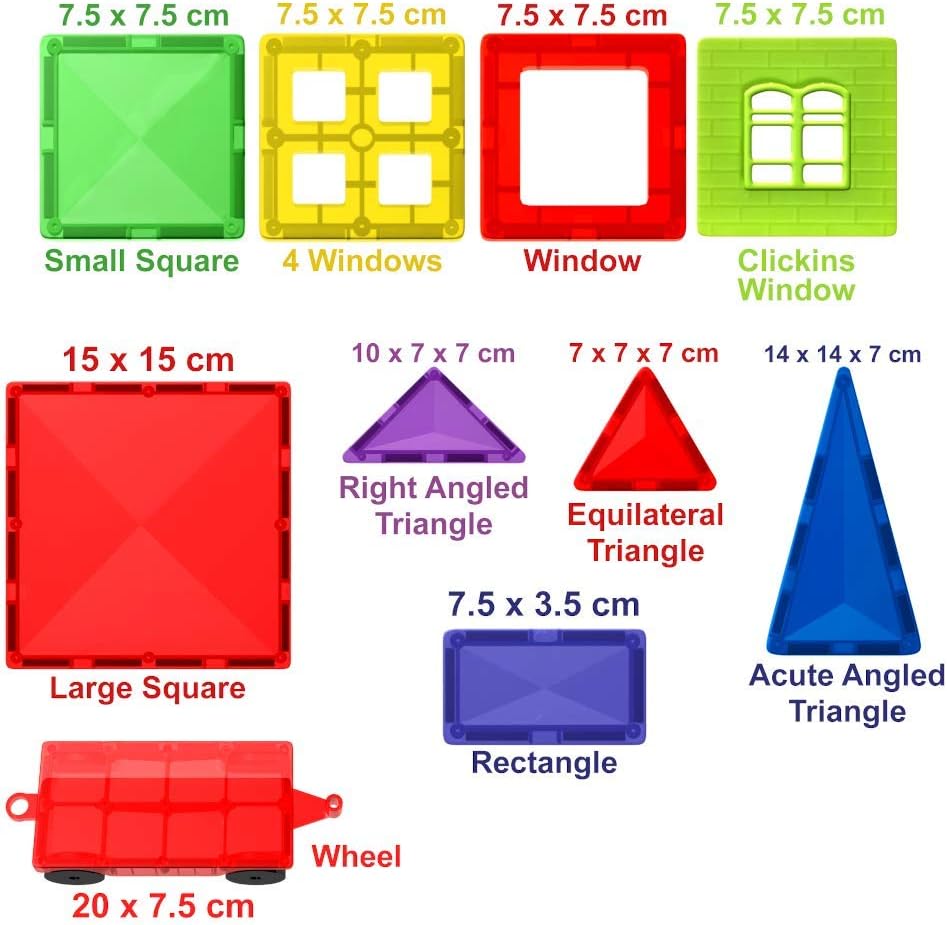- Package Include: Square 20pc, Equilateral Triangle 12pc, Right angled triangle 2pc, Acute Angled Triangle 4pc, Four Windows 2pc, Rectangle 4pc, Window Empty 4pc, Large Square Base 2pc, Clicking Window 4pc, Wheel Base– 1pc, Manual - 1pc, Retail Box - 1pc