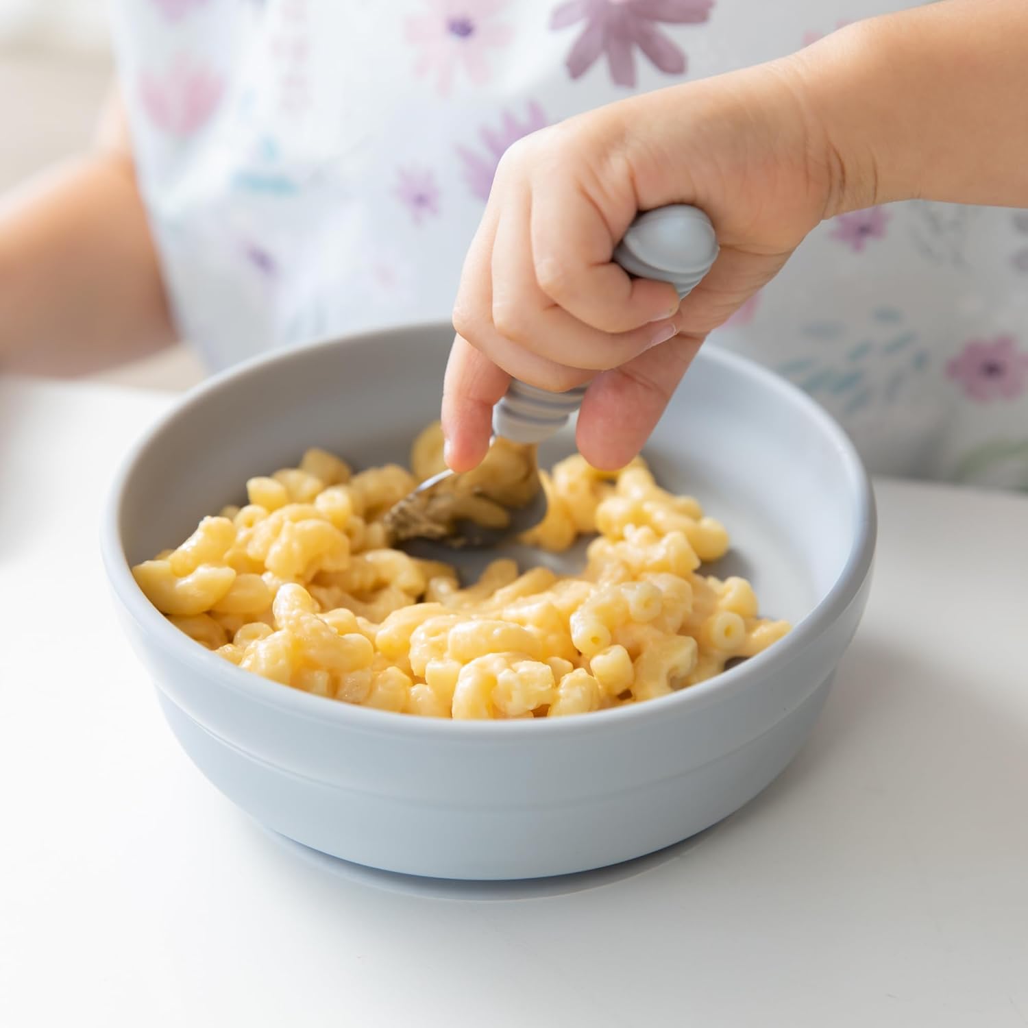 - TODDLER UTENSILS β This set is sized and shaped just right for self-feeding; concave stainless-steel fork and spoon heads help keep food on the utensils; outer fork tines are bent (like a spork) to help pierce solid foods and keep food on the fork