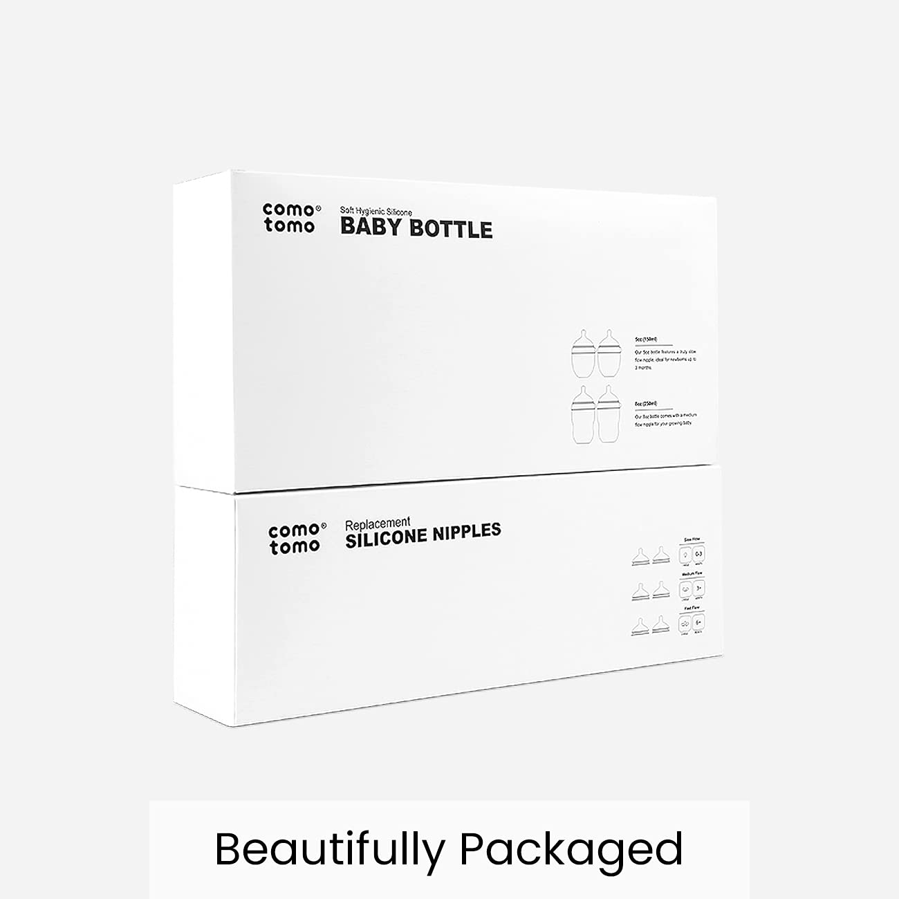 - Comotomo's Baby Bottle Bundle includes two 5oz. bottles, two 8oz. bottles, and a package each of our slow flow, medium flow, and fast flow replacement nipples. (Replacement nipple packages come with two nipples each.)