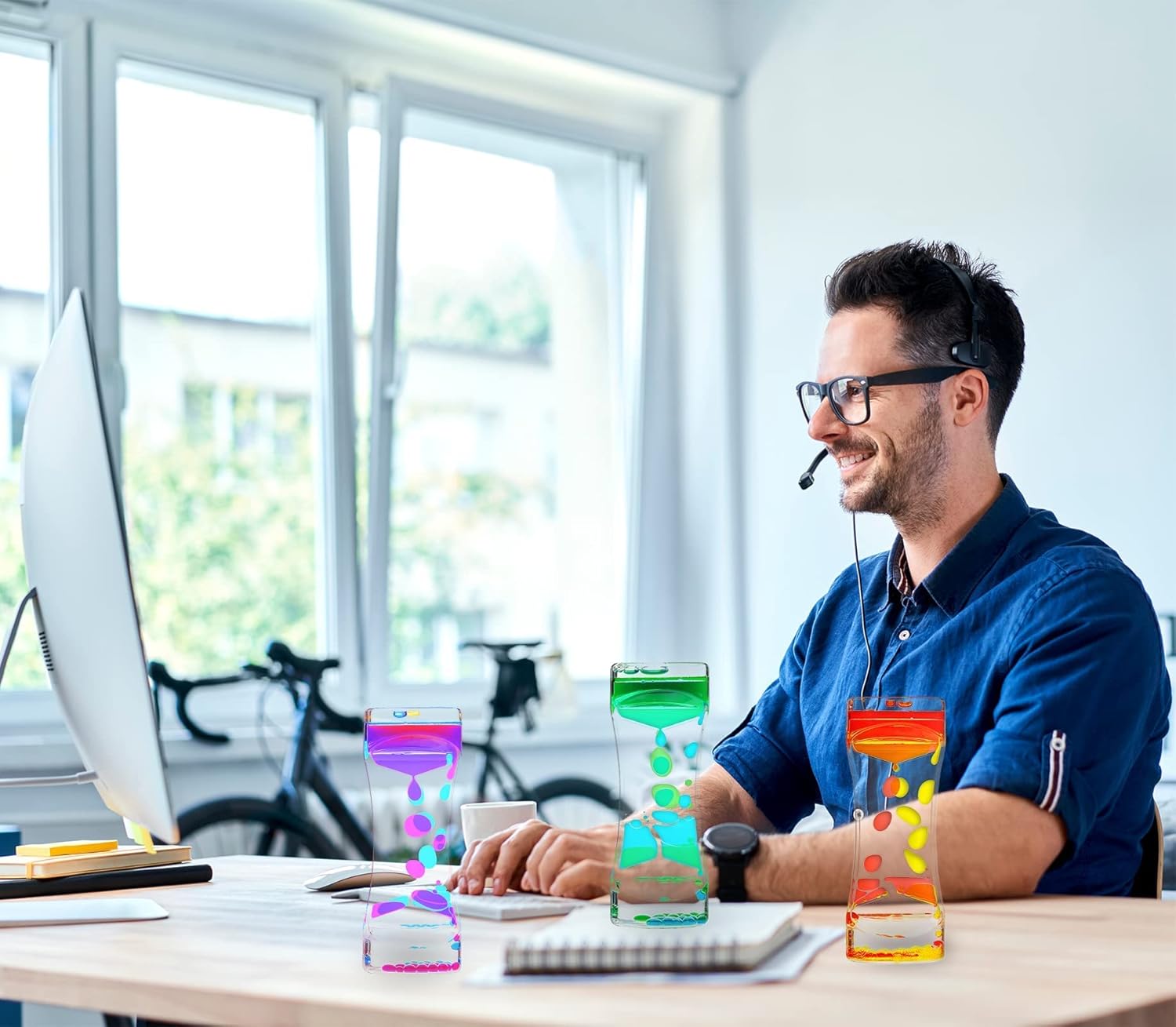 - 3. Mesmerizing Visual Effect: The oil droplets can even make the colorful wheels spin. Just flip this cool liquid motion timer over and start again until you are fully relaxed.It has a mesmerizing effect when you watch the bubbles travel down in slow motion. These liquid motion bubblers will actively work to relieve your stress and provide you with hours of calming entertainment at home or even at the office. It’s also an entertaining office table decoration.