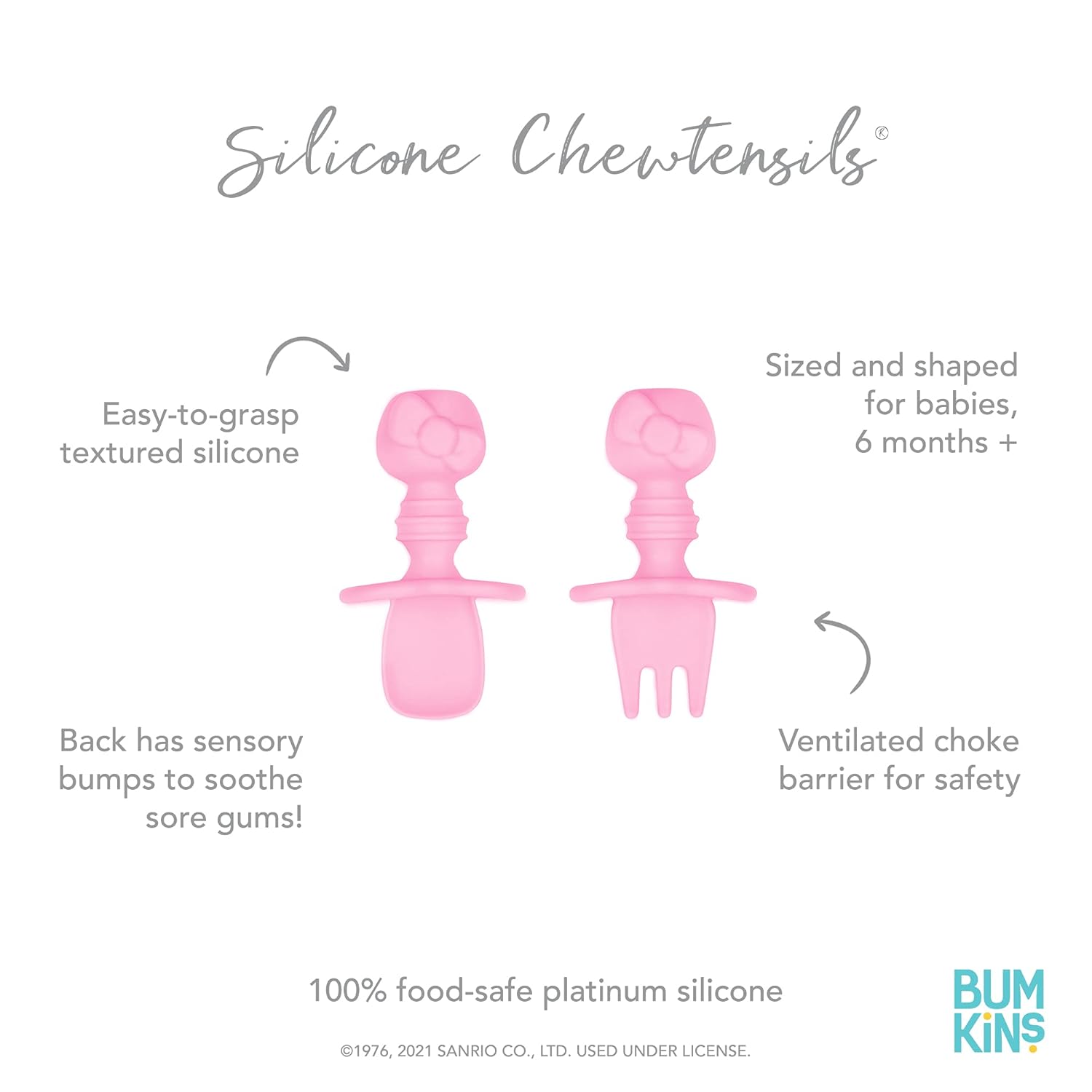 Bumkins Baby Utensils Set, Chewtensils Silicone Spoons for Dipping, Self-Feeding, Baby Led Weaning, Trainer Learning, First Stage Eating, Soft Practice Fork and Spoon, 6 Months, Hello Kitty Pink