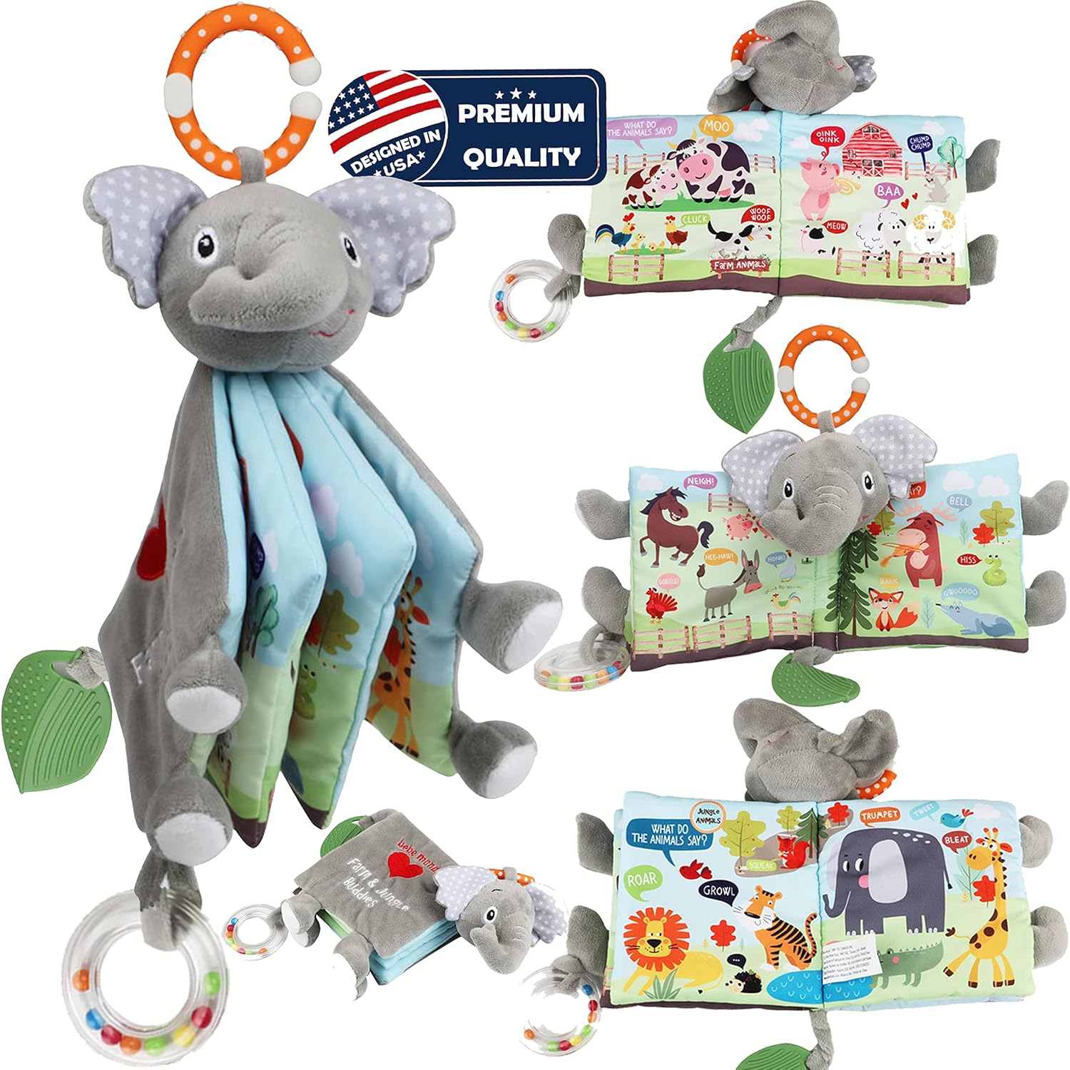 - Premium Baby Gifts (Unisex), Super Soft Plush Elephant Teether Toy: Funny baby book with Farm and Jungle theme; this High contrast baby toy with rattle and textured teethers help stimulate important key skills,such as language & reading, communication, imagination and sensory skills. Additionally,the flaps on each page will give your child a hand to practice turning the page & move to the next one, very helpful to develop fine motor skill! You'll love it!