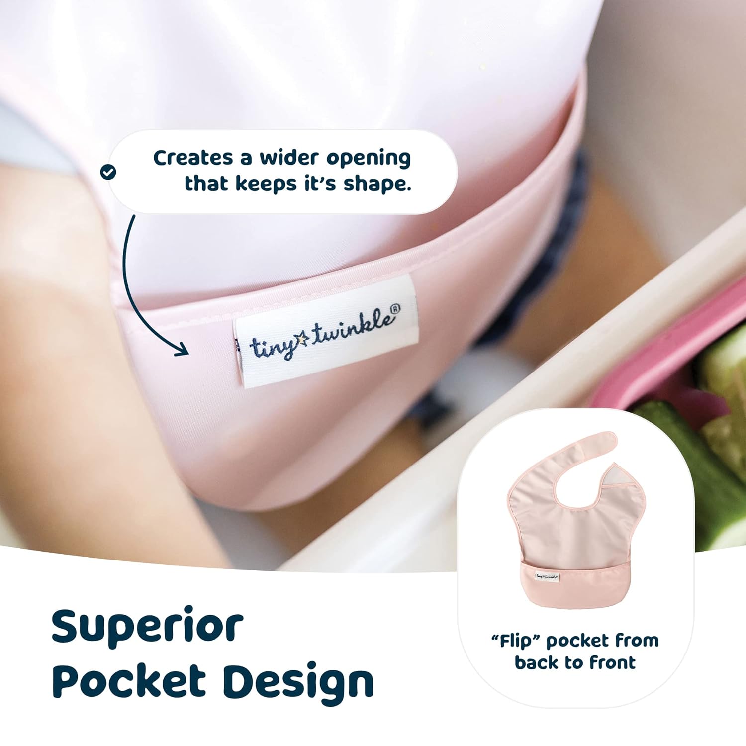 - BABY ESSENTIALS MUST HAVES: Tiny Twinkle presents essential baby feeding supplies with our baby feeding bibs.Crafted from soft,lightweight,water-repellent recycled polyester,these waterproof bibs for baby boy or girl are designed to keep messes at bay.Our baby food bibs feature a catch-all pocket to capture spills,ensuring your little one stays clean during mealtime.