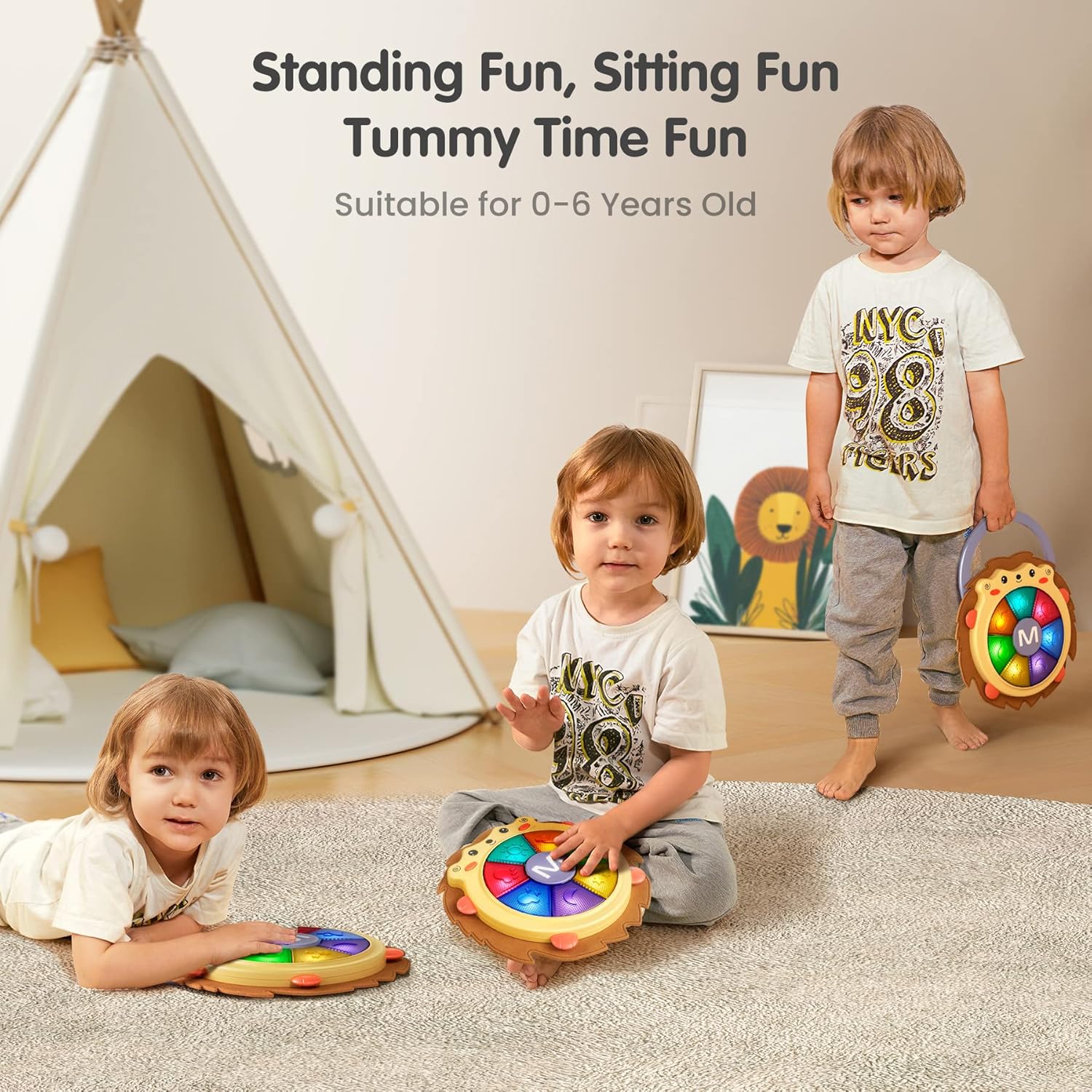 - Baby Music Sound & Light Toy: (powered by 3 x 1.5V AA batteries, not included in the package): There are 2 different modes in the toy for children to choose: 7 animal sounds and baby songs and 7 different drums. The colorful lights catch baby’s attention that they can make different sounds by playing drums with his hands.