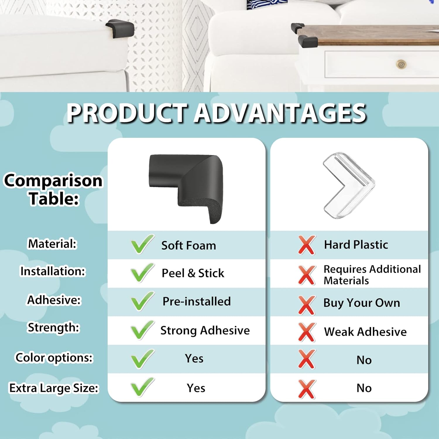 - Wide Application:Corner guards can be used for sharp edges of tables, chairs, furniture and fireplaces, and any hard corner that may cause accidental injuries to our children. Give babies a bigger space to play.