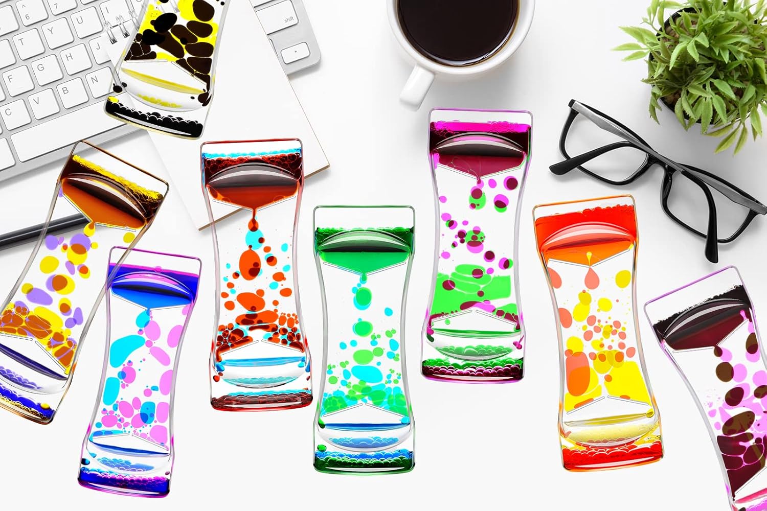 - 2.Liquid Bubbler Timer Toys: Great desk sensory play top toy for all ages ranging from children to adults. A great Home Ornament and office relax decor. The soothing rainbow colors remind you to slow down, relax and enjoy every moment. The liquid motion bubbler will help your calm down or focus on something.
