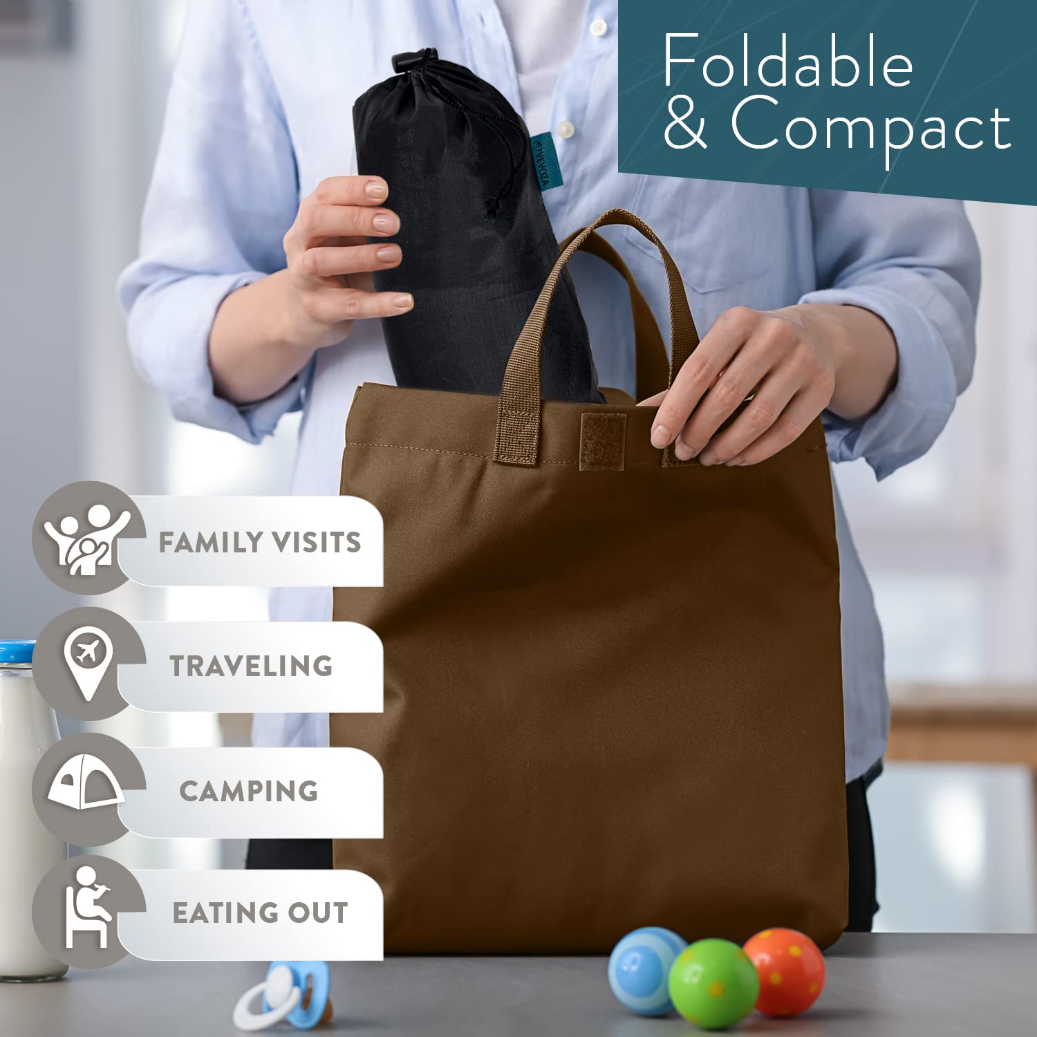 - 【 COMPACT, FOLDABLE & LIGHTWEIGHT BABY TRAVEL CHAIR 】 Unlike bulky options, our portable baby seat easily folds into a compact roll that fits into any bag. It’s a must-have travel booster for family trips, camping, flying, or visiting friends and family. A convenient storage bag is included to keep your portable high chair for toddlers 1-3 ready for any adventure.