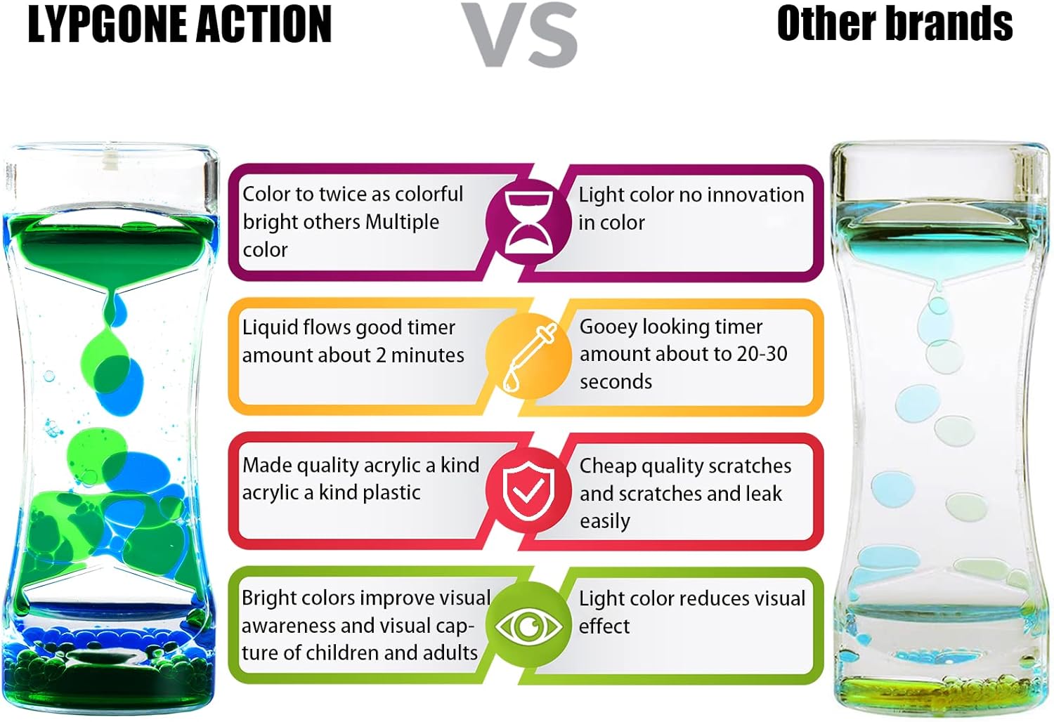 - Perfect Liquid Bubbler Timer Toys- A gentle fidget toy that pleases the eye and eases for comfort. It relaxes with its colorful droplets flowing to the bottom. Sure, our liquid bubblers can be gifted to your kids for hours and hours of fun, but they can also be used by adults to manage their stress or even as decorative pieces to give your office desk an awesome look