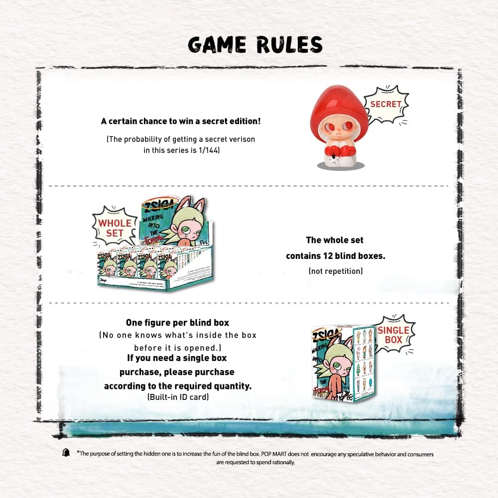 - POP MART Zsiga Walking into The Forest Figures: Box toys are collectibles that come in a sealed box, with the content unknown to buyers until they open it. This collection contains 12 regular figures, and 1 hidden edition (Mushroom).