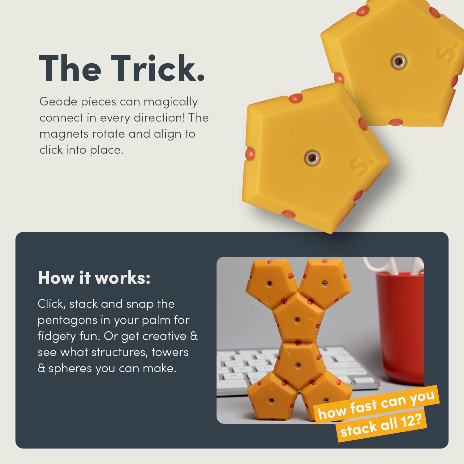 - FUN FRUSTRATION FREE FIDGET: Fidget to find your favorite configuration! Geode pieces connect on every side so you’ll always find a connection. Easy to use, harder to master - you’ll be playing with these pentagons permanently! Way more fidgeting fun than a fidget spinner, trust us!