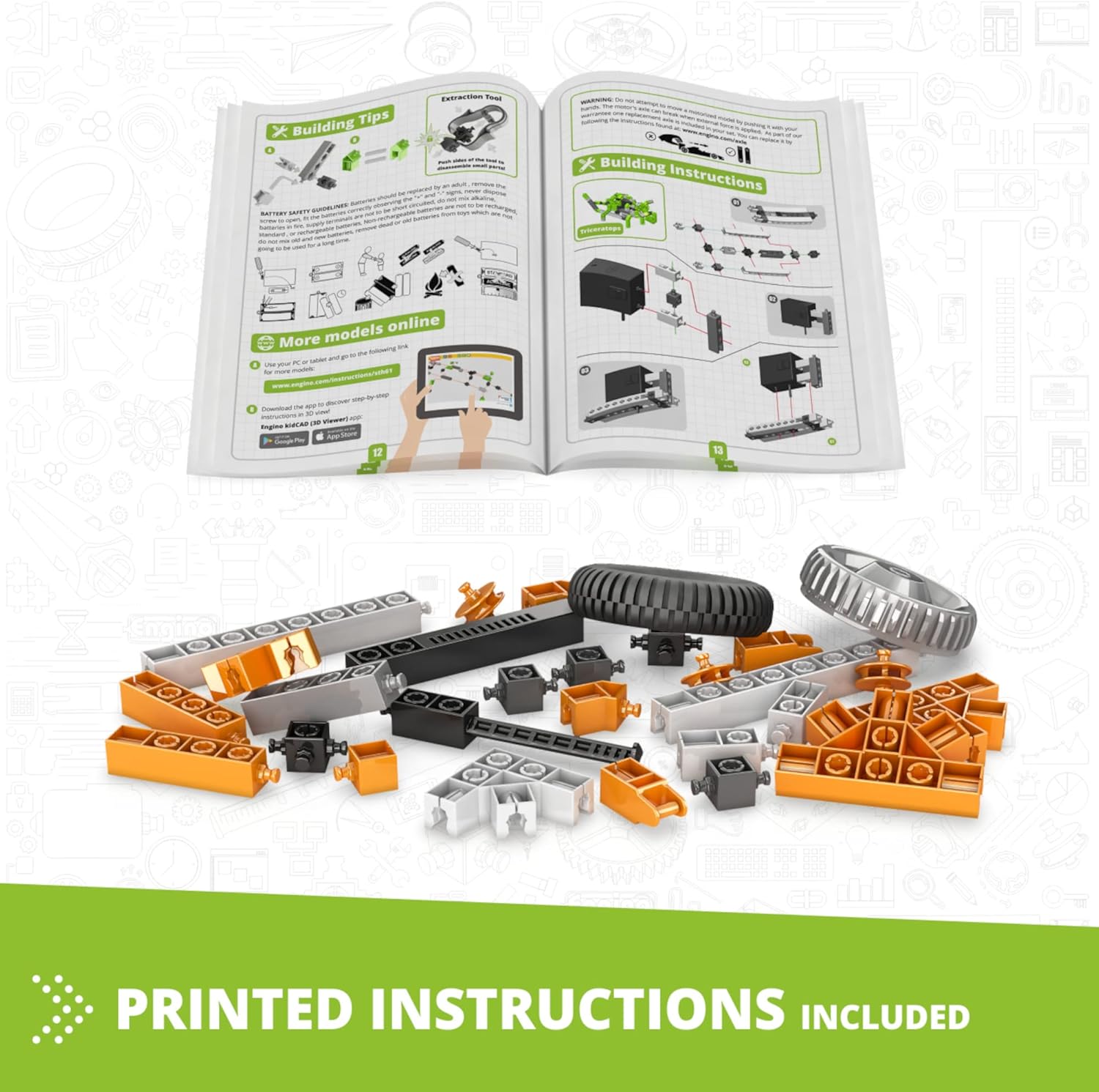 - EXPLORE STEM CONCEPTS: Build 5 motorized working models, such as a brontosaurus, a stegosaurus, a triceratops and more. Thanks to the kit's motorized components, your child can bring each model to life and watch as it moves and interacts with its surroundings.