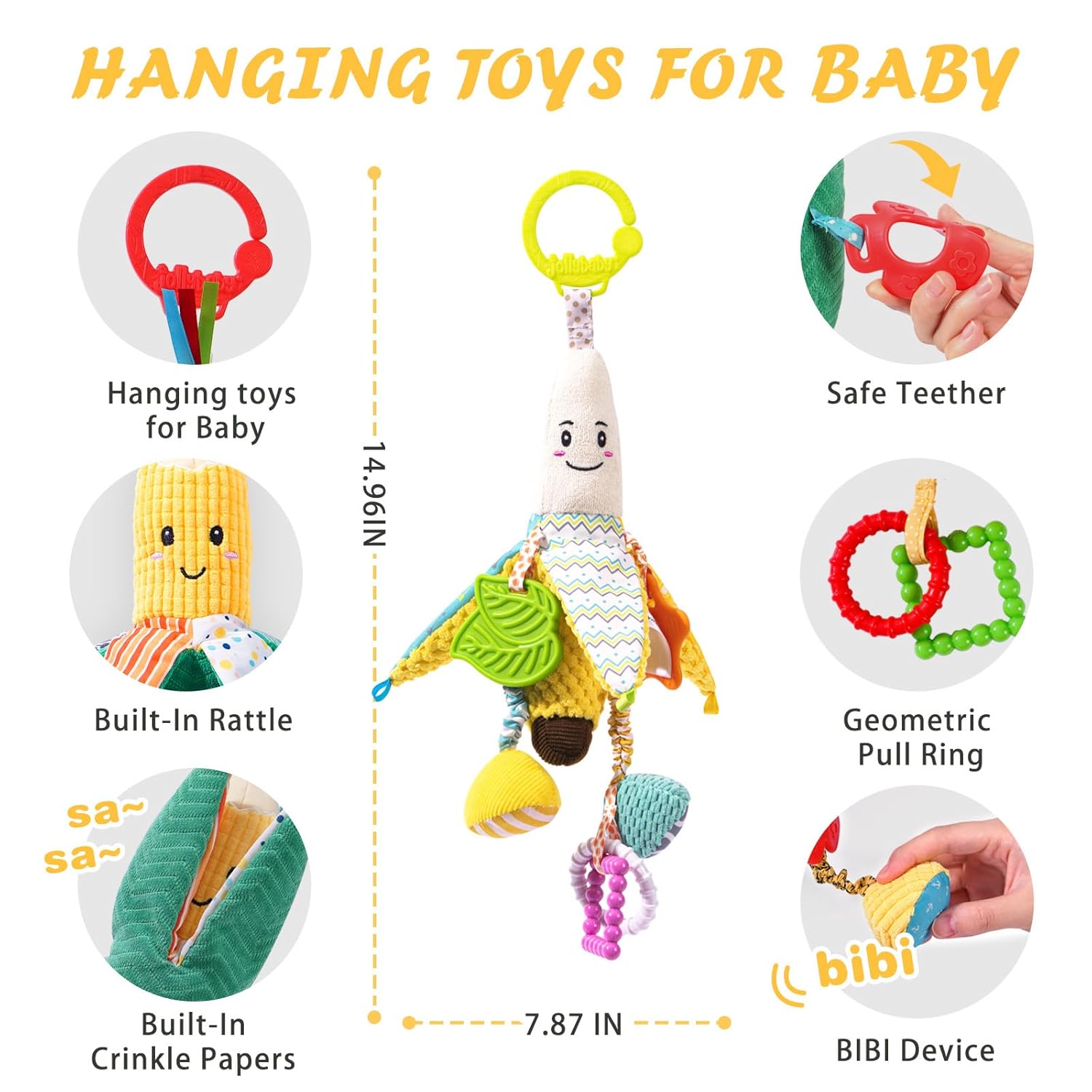 Jollybaby Stroller Rattle Toys for Car Seat Parm, Fruit Plush Hanging Infant Crib Bed Travel Activity Ring Bell with Crinkle, Squeaky & Teether for Boys Girls(Banana)