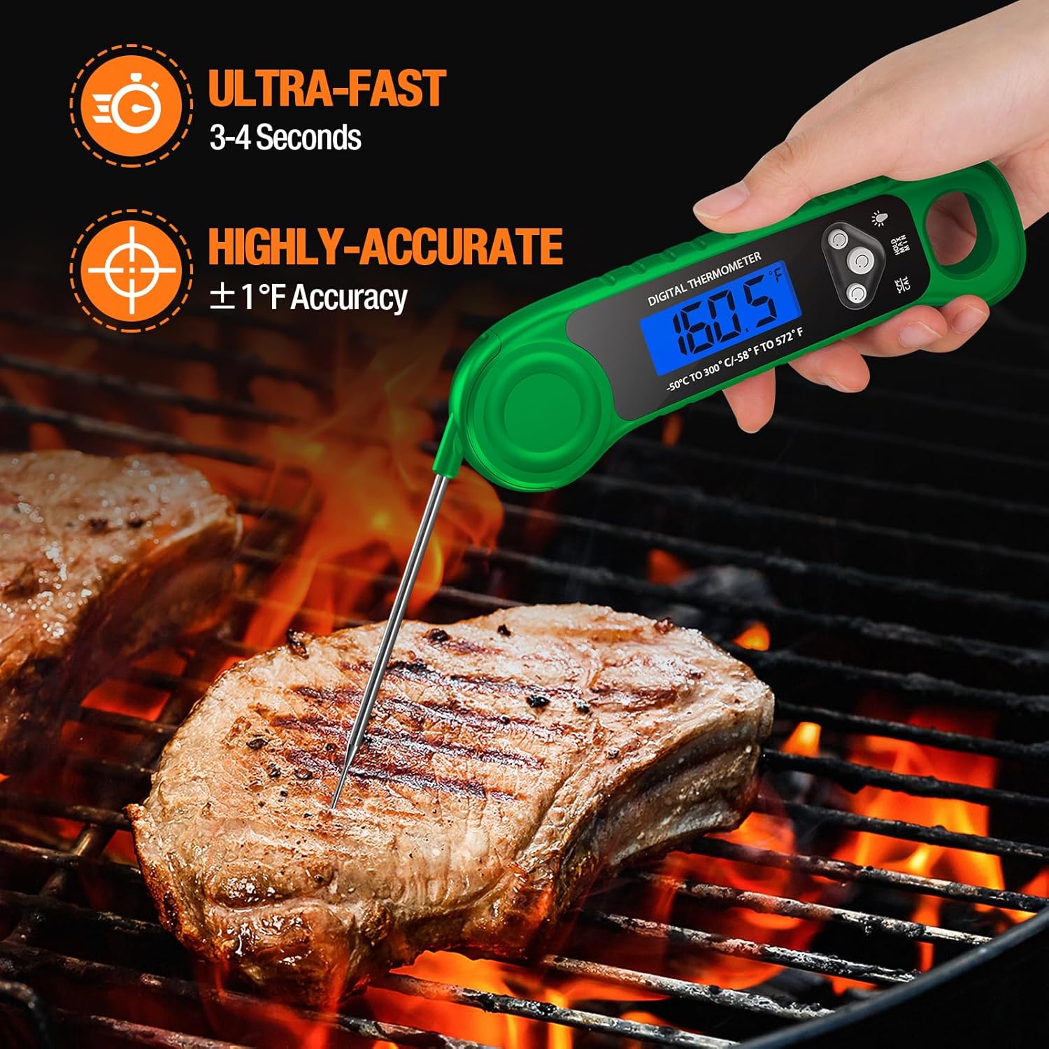 - ULTRA-FAST & HIGHLY ACCURATE: With a precision sensor, this Digital meat thermometer reads temperature in 2 to 4 seconds and is accurate within 2 °F . Supporting Celsius and Fahrenheit display from -58°F to 572°F (-50°C to 300°C) makes the food thermometer suitable for BBQ, grill, pan-frying, baking or candy making.