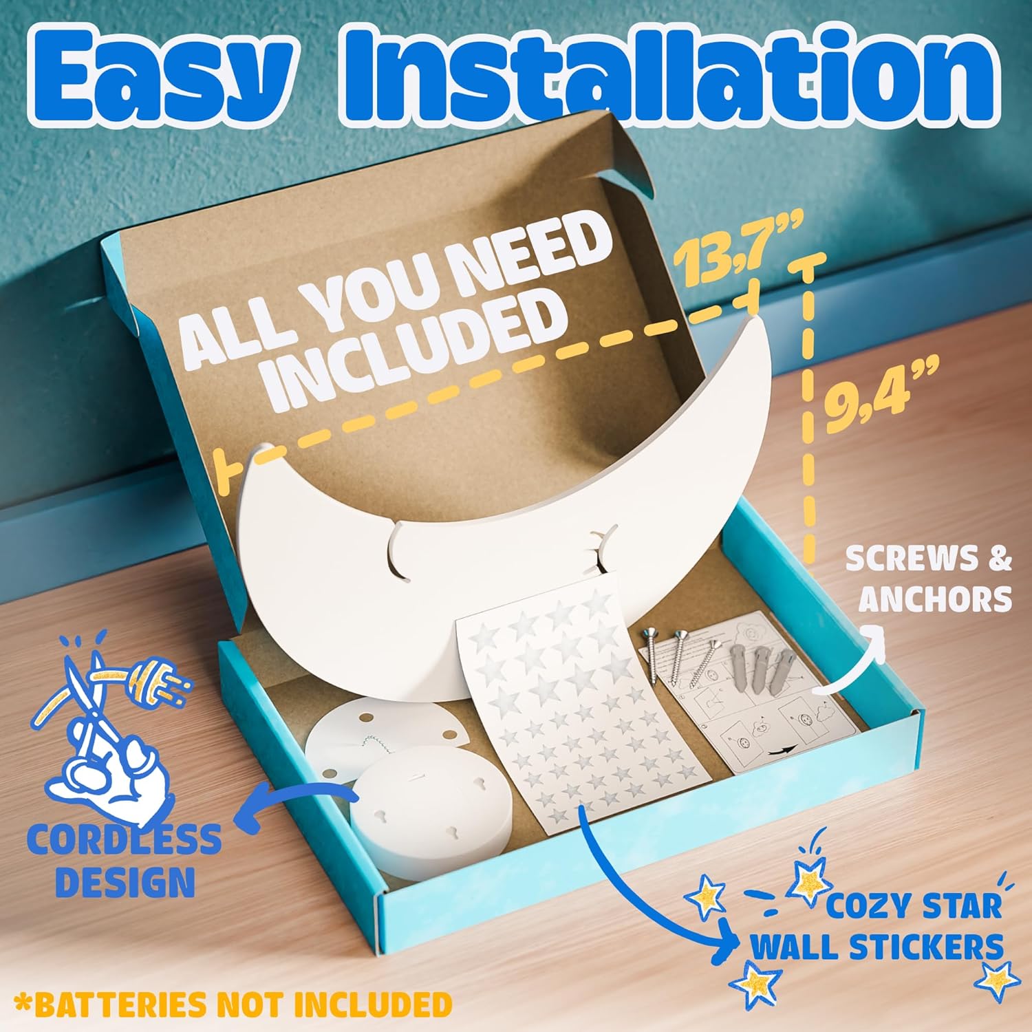 - Battery-operated and easy to install: This Baby nightlight is powered by batteries, making it a hassle-free option for parents who want to avoid cords and wires in their child's room. It's also easy to install by screwing a screw into the wall and then hanging the lamp on the screw.