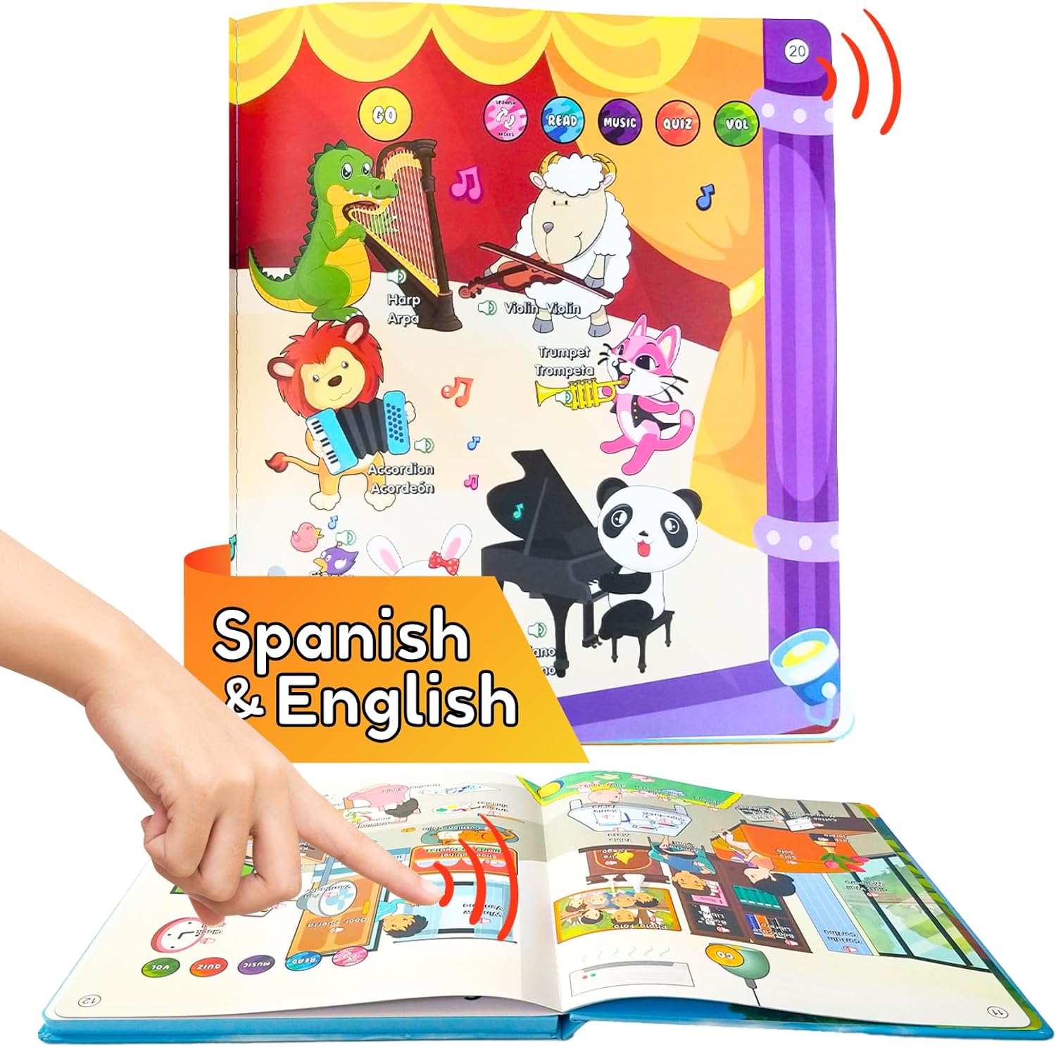 - Musical Bilingual Toys for Toddlers. It's not only an educational talking book but also a Spanish toy with nursery music. Both parents and babies will enjoy this book as it has great function and durable pages.