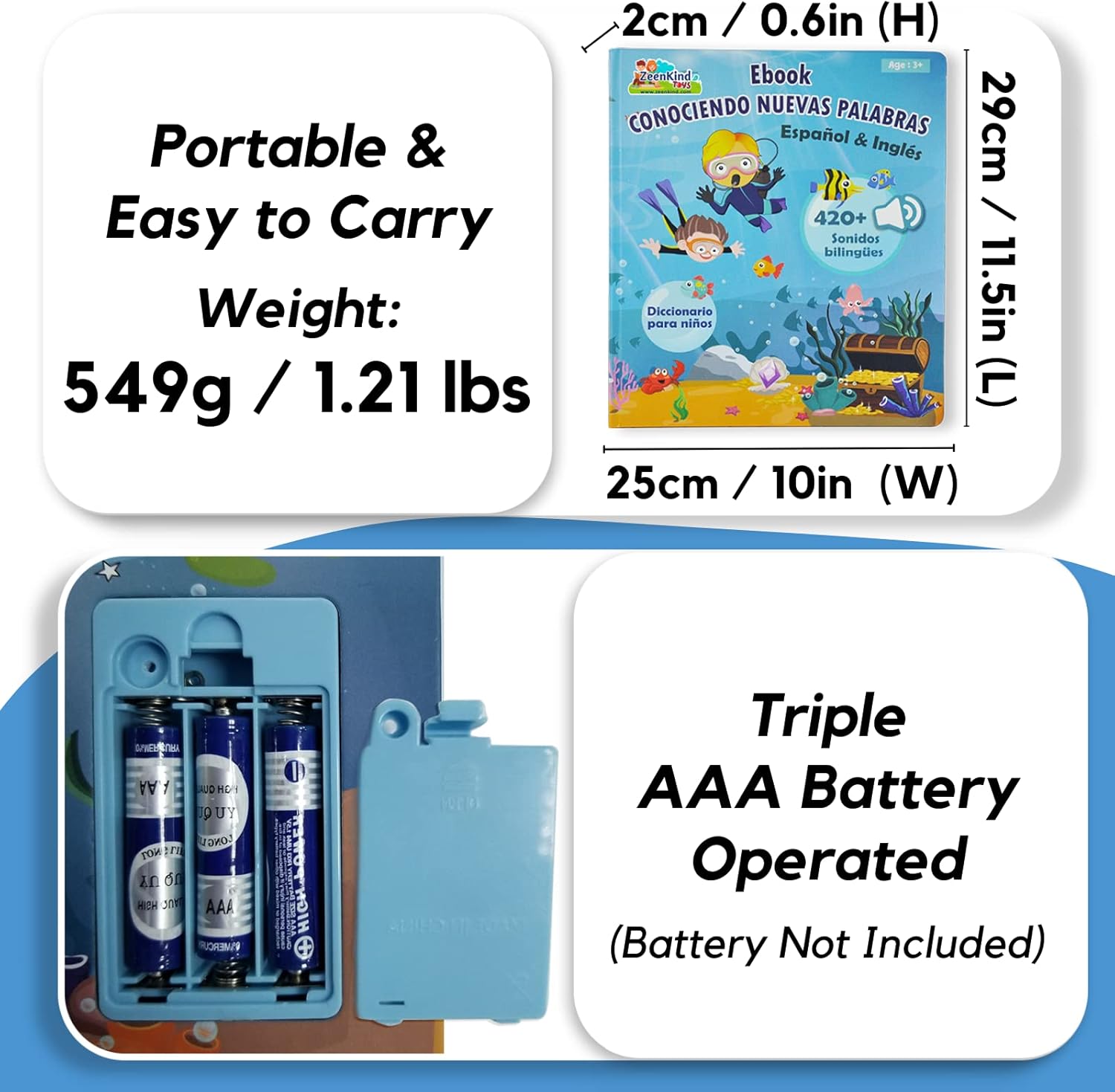 - Your Satisfaction Matters: We stand by the quality of our Spanish language books for kids. If you're unhappy, you can return it within 30 days of purchase. This book can either be recharged or used 3 AAA battery, batteries are not included.