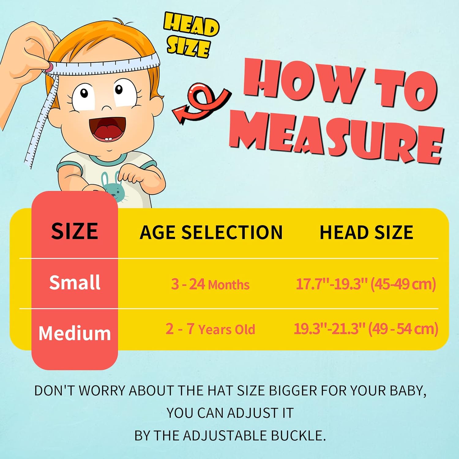 • 【ADJUSTABLE TO GROW WITH KID】Sun hat for kids has two sizes: Size S: 3-24 months fits head circumference 17.7"-19.3"; Size M: 2-7 years fits head circumference 19.3"-21.3". The stretchy headband and rope buckle behind the sunshade hat can adjust the head circumference for a comfort fit. Great for your toddler boy or toddler girl, and big kids too! So, this durable infant hat will definitely grow with your kids for a long time.