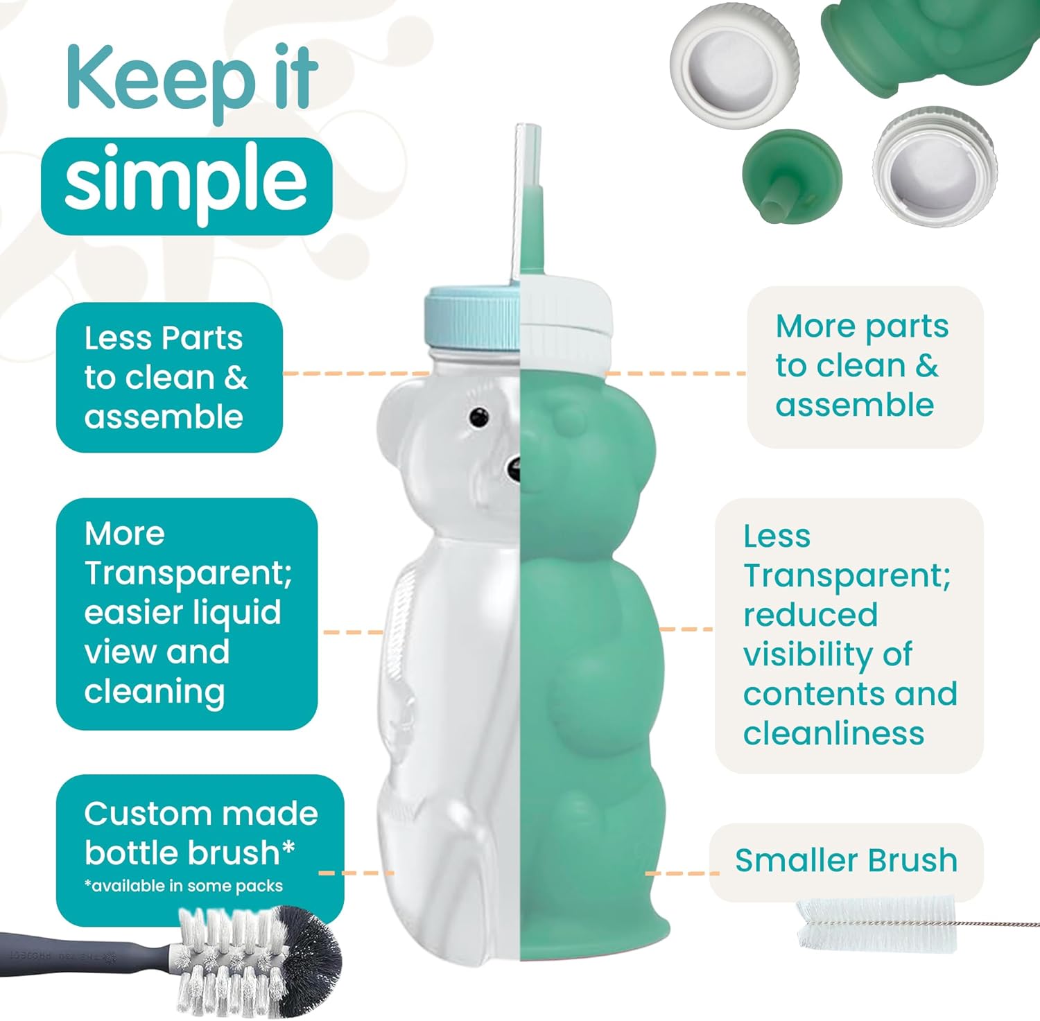 - Travel Pack: Our easy squeeze straw cups set comes with 2 bottles + lids, 4 straws, 2 travel lids, & a custom straw cleaner. These BPA-free & recyclable honey bear bottles with straws are leak-resistant, dishwasher-safe, and easy to clean & maintain.