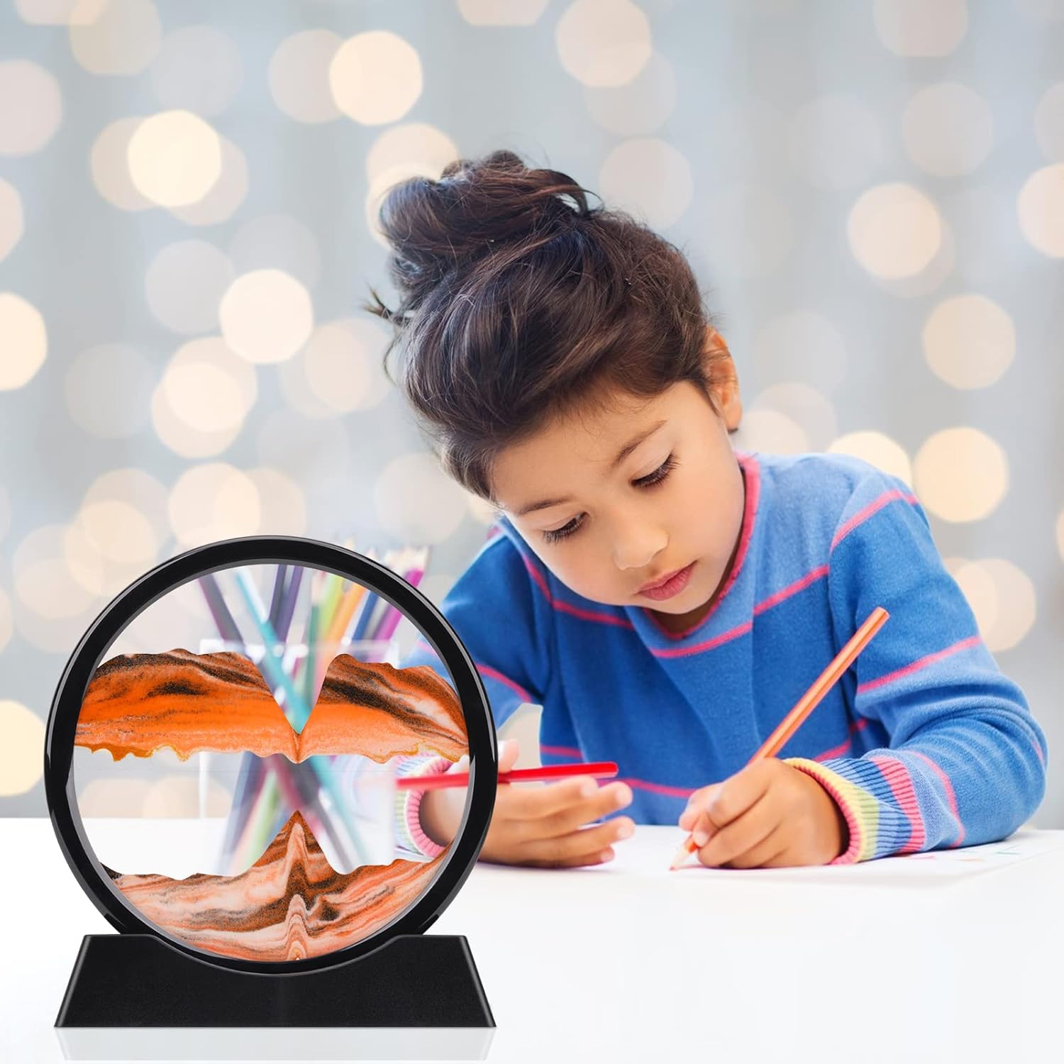 - CALMING SENSORY TOY: Moving sand pictures create a new sand picture with each turn.The sand never makes the same design twice. Watching the colored sand slowly tumble down the circle is relaxing and calming to the mind, which can relieve stress, relax your eyes,cultivate patience. give you unexpected surprise