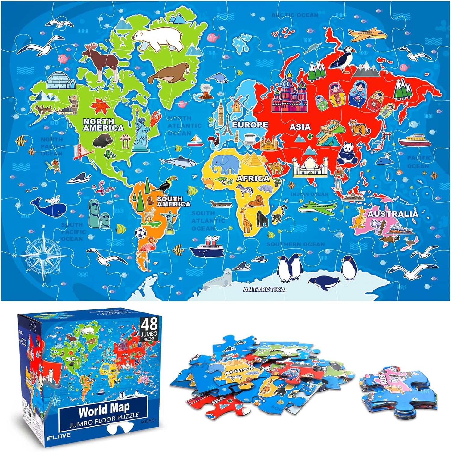 - Large 48-piece Comprehensive World Map:This 48-piece jumbo floor puzzle features a highly detailed and comprehensive world map, displaying all seven continents and five oceans. The vibrant colors and attention to detail make it an engaging and educational toy for kids