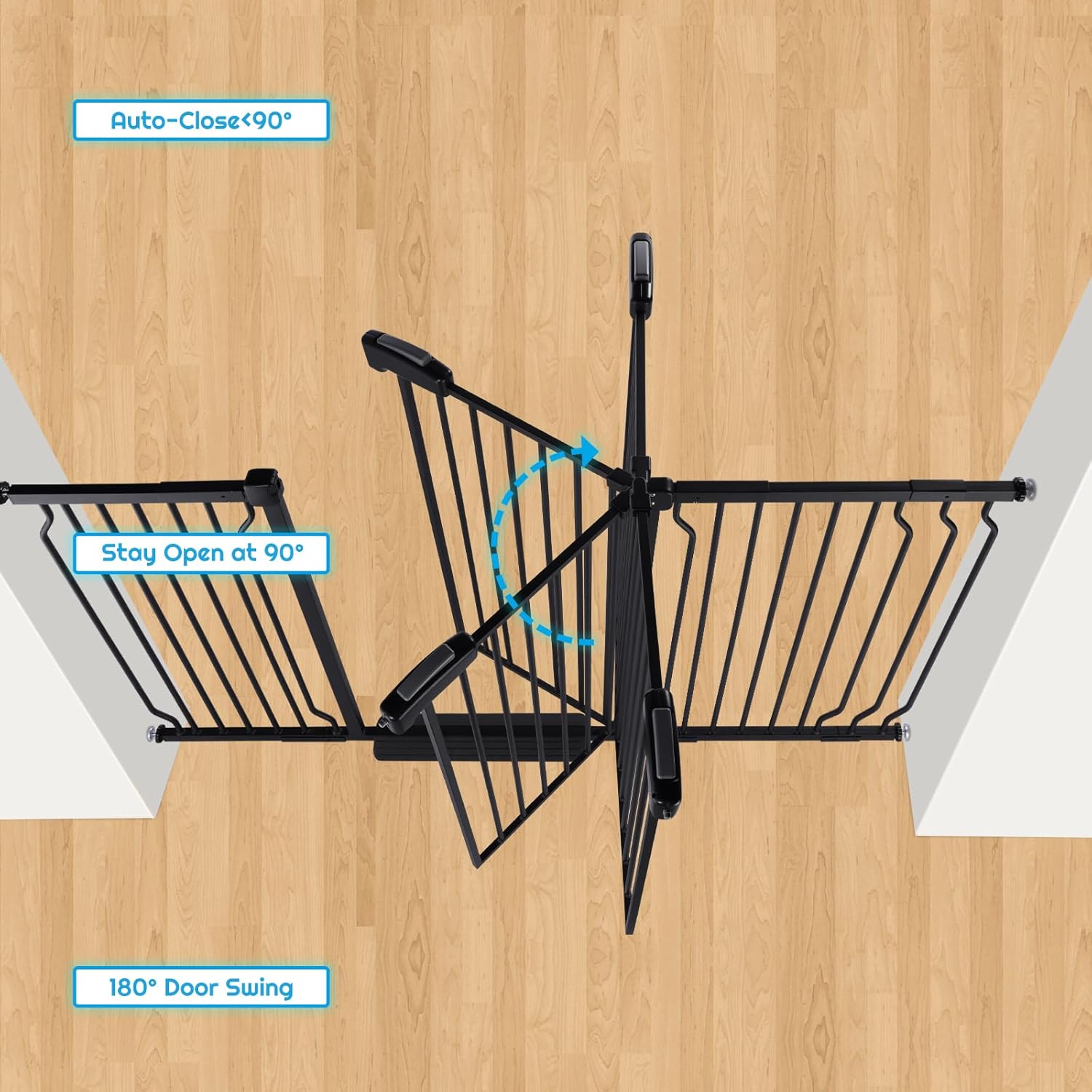 - Safe Double Lock & One Hand Operation: The safety gate latch with an ergonomic handle can be released with one hand, convenient when holding a baby in the other hand. Just press the latch down, pull back and lift slightly. Easy for adults, but difficult for toddlers, children or kids. Two-way swinging door. If opening angle is less than 90°, baby gate will be closed automatically; but if opening angle is more than 90°, baby gate will keep opening.