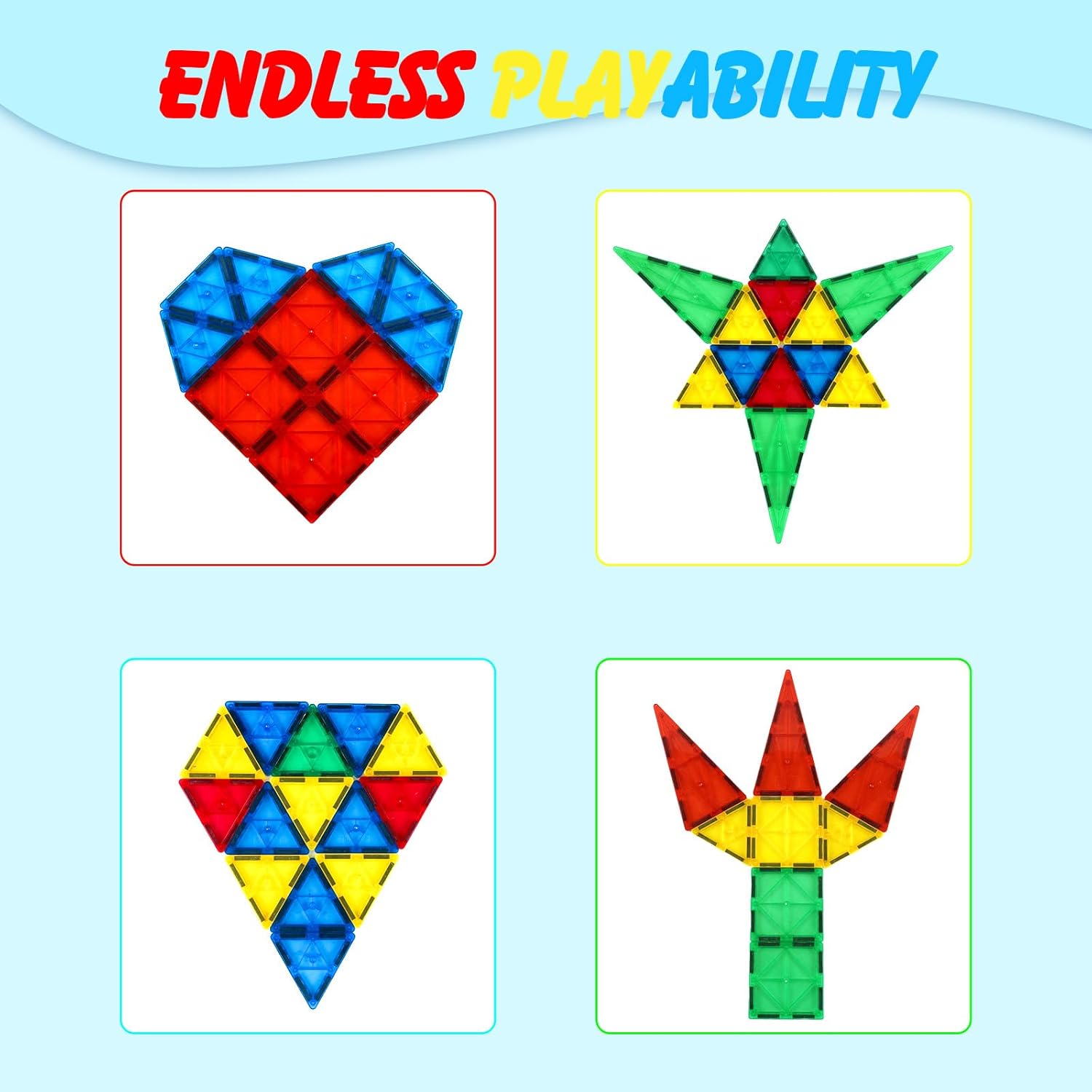 - STEM Approved Toy: Gemmicc Magnetic tiles set is suitable for classroom, family, kindergarten, day care centers etc. This toys set can help enhance your kids' fine motor skills, color and shape recognition ability, Children can build anything they imagine, from 2D planar shapes to 3D geometry, your children will feel a sense of accomplishment during the play