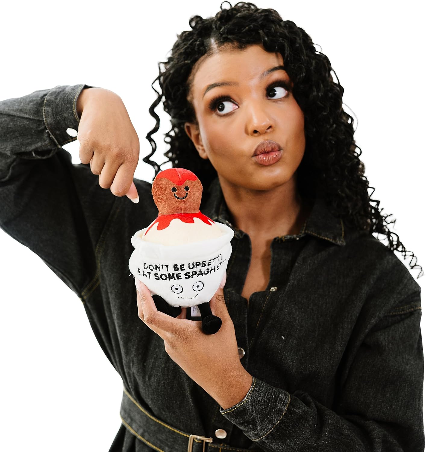 Spaghetti Foodie Plushie, Funny Pun Meme Gag Gift, White Elephant, Stocking Stuffer Present, Great for Emotional Support, Fun Desk Accessory, Weighted Base for Display