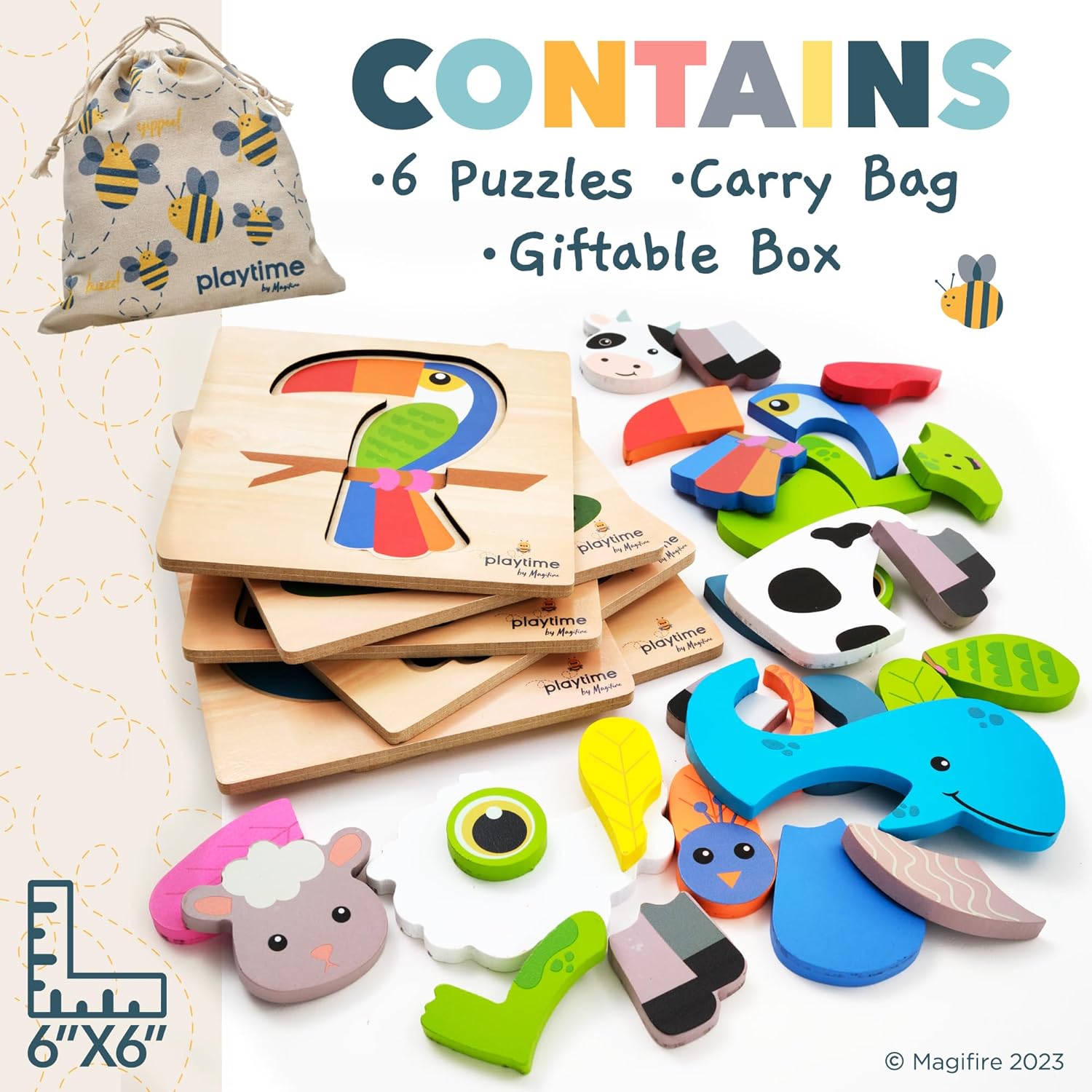 MAGIFIRE Wooden Puzzles for Toddlers 1-3 - 6-Pack Multicolor Cartoon Animal Puzzle Set - Large Easy-Grip Pieces for Small Hands with Storage Bag and Box