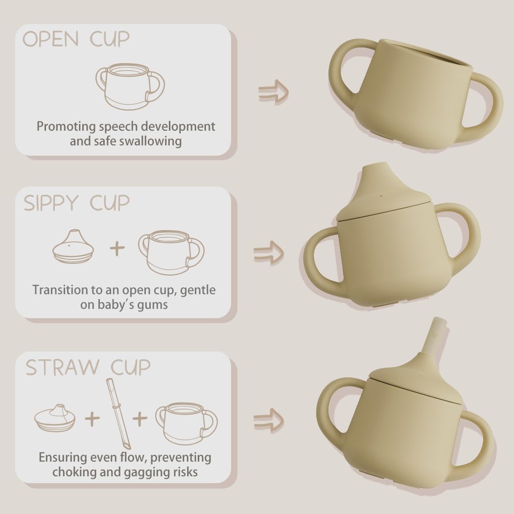 - ăThree-in-one Design (with straw + spout + open cup)ă Our baby cup features a versatile three-in-one design that can be converted from a sippy cup to a straw cup to an open cup, encouraging your baby to develop drinking skills.The open cup promotes lip closure, speech development, and safe swallowing while also preventing tooth decay. Going from a straw to independent drinking is such a huge milestone for early development, so we have designed one cup that will be there for every step.