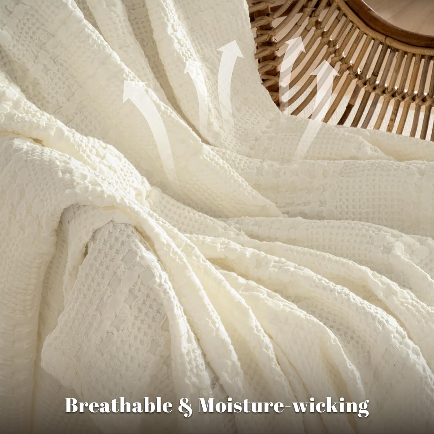 PHF 100% Cotton Waffle Weave Blanket Queen Size, Soft Lightweight Breathable Cozy Summer Blankets for Bed, Luxury Aesthetic Woven Bedding for Home Decor, 90"x90", Cannoli Cream
