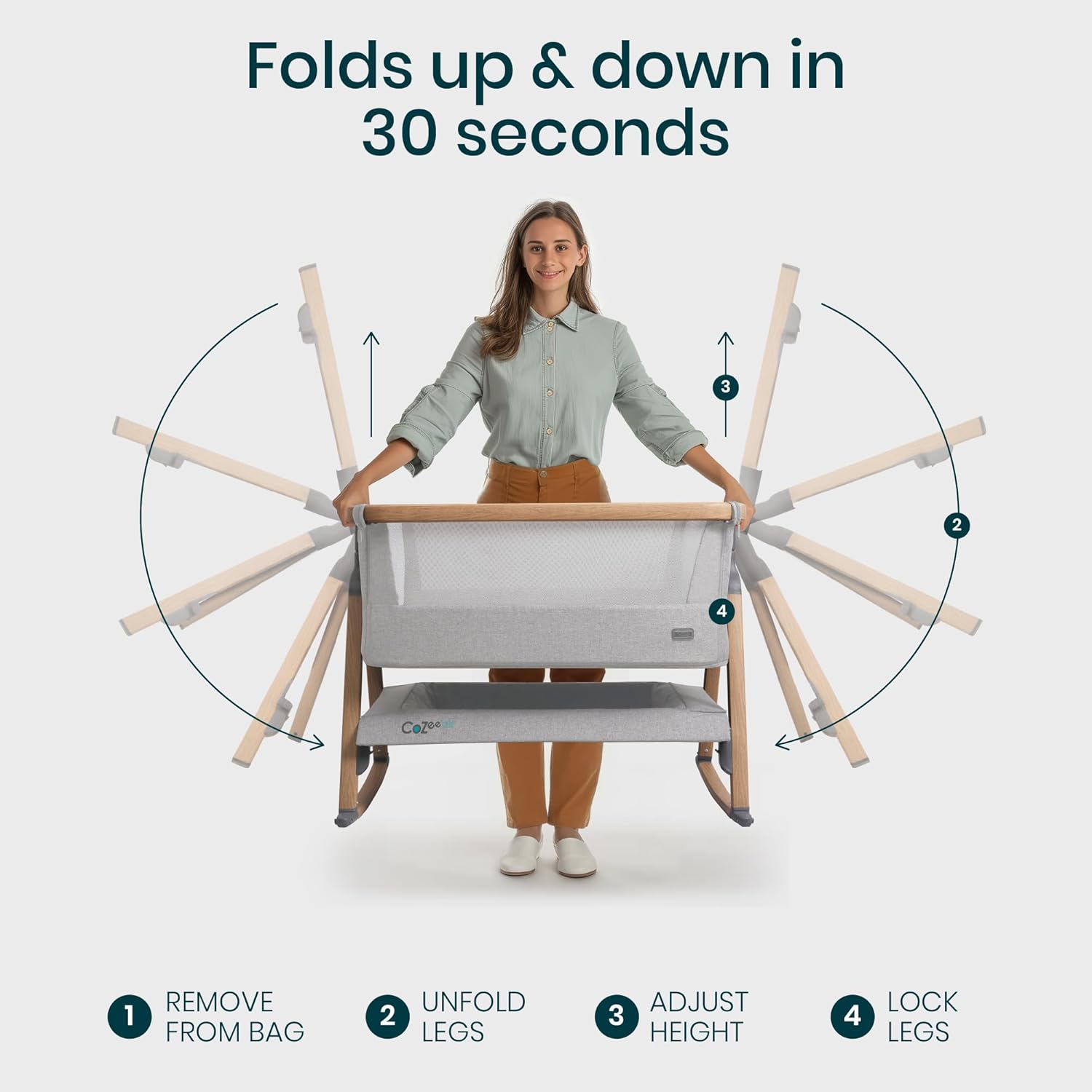 - SET UP IN 30 SECONDS - Thanks to our innovative fast-folding mechanism, the baby bedside bassinet is ultra-quick to set up! The wood-effect legs lock securely into place to keep the bedside crib stable.