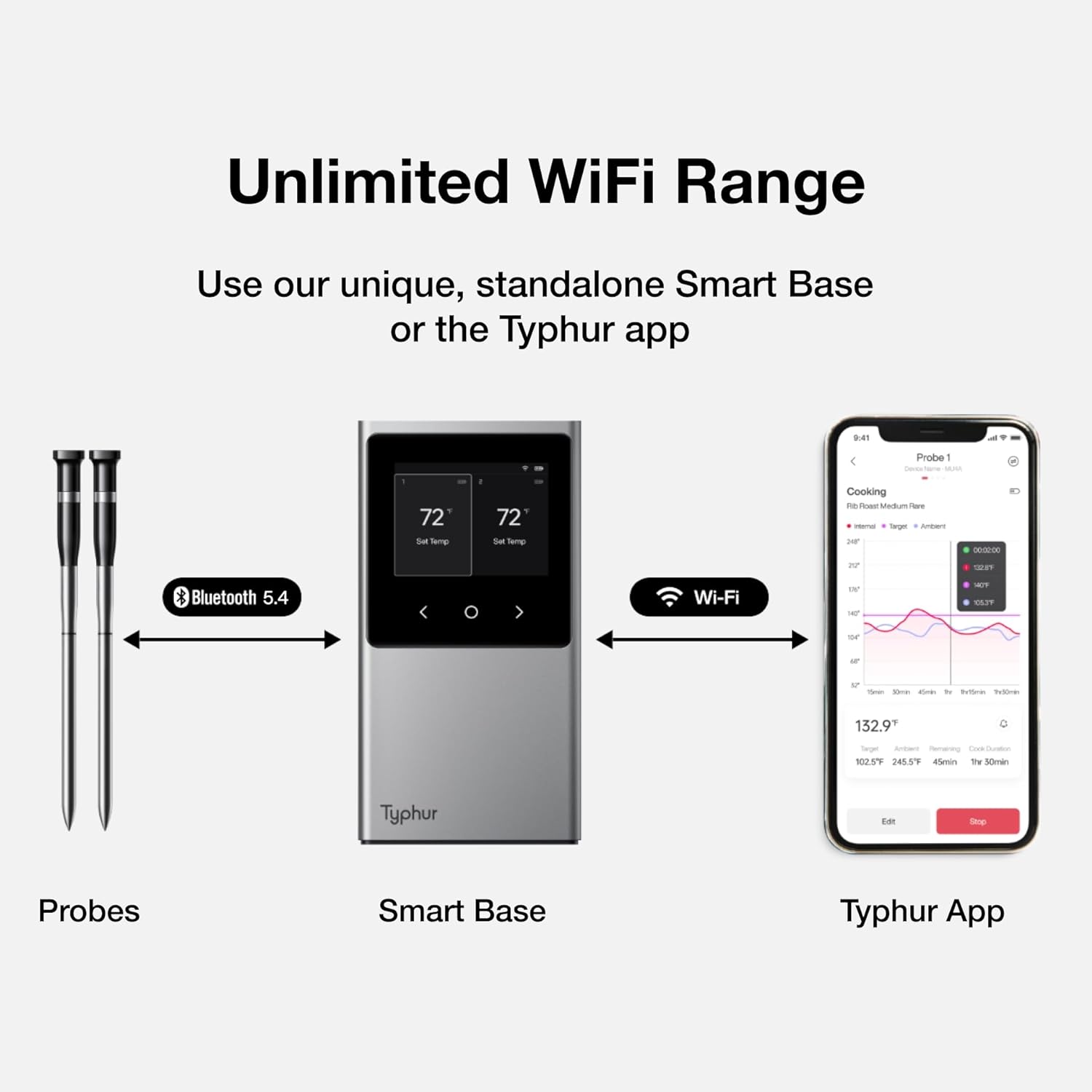 Sync WiFi Wireless Meat Thermometer Digital, 2 Probes, Smart Base, LCD Display, Unlimited Range, Bluetooth 5.4, Improved Stability, NIST-Certified Accuracy, BBQ, Grill, Smoker, Oven, Kitchen