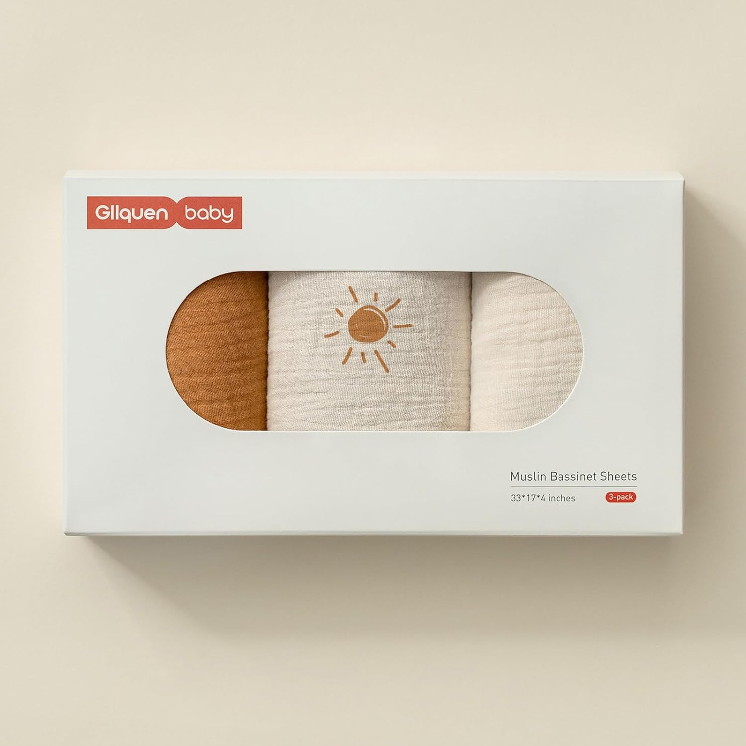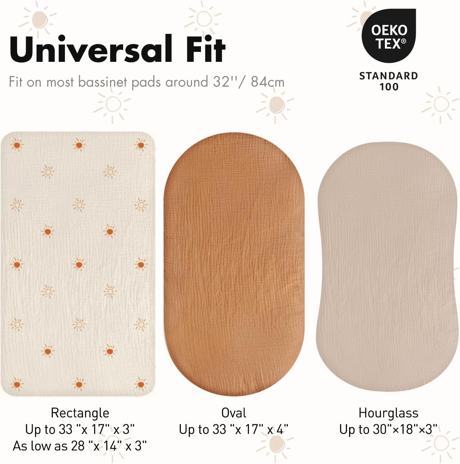 Gllquen Baby Muslin Bassinet Sheets 3 Pack, Breathable Elastic Cozy Fitted Cotton Bassinet Mattress Sheet for Baby Boy Girls, Fit for Hourglass Oval Rectangular Cradle Pad Sheets 33"x17" (Sunshine)