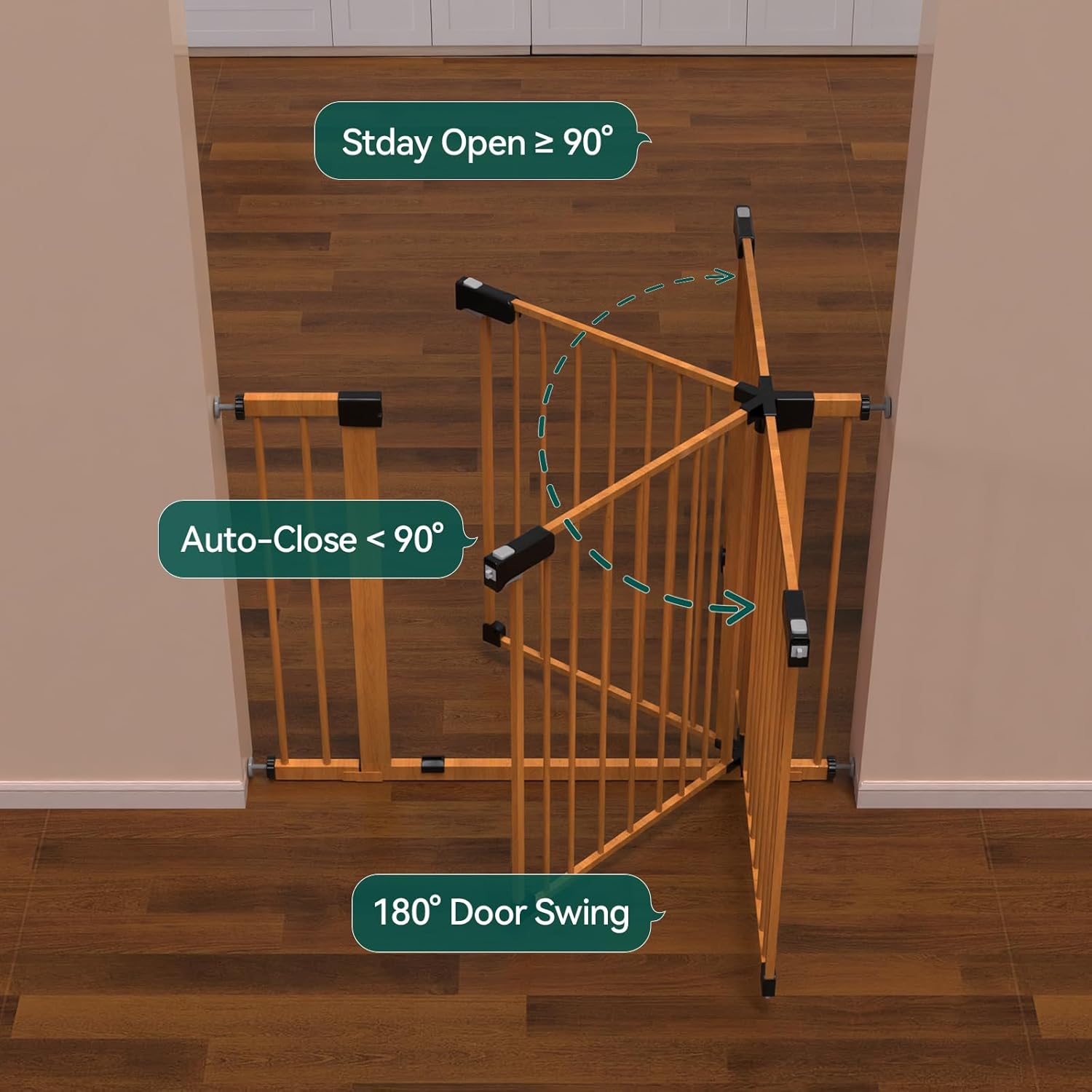 - 【AUTO-CLOSE DESIGN】:The wooden gate stops at 90° and auto-closes when opened less than 90°. Perfect when your hands are full—simply pass through, and it will securely close behind you, keeping baby safe