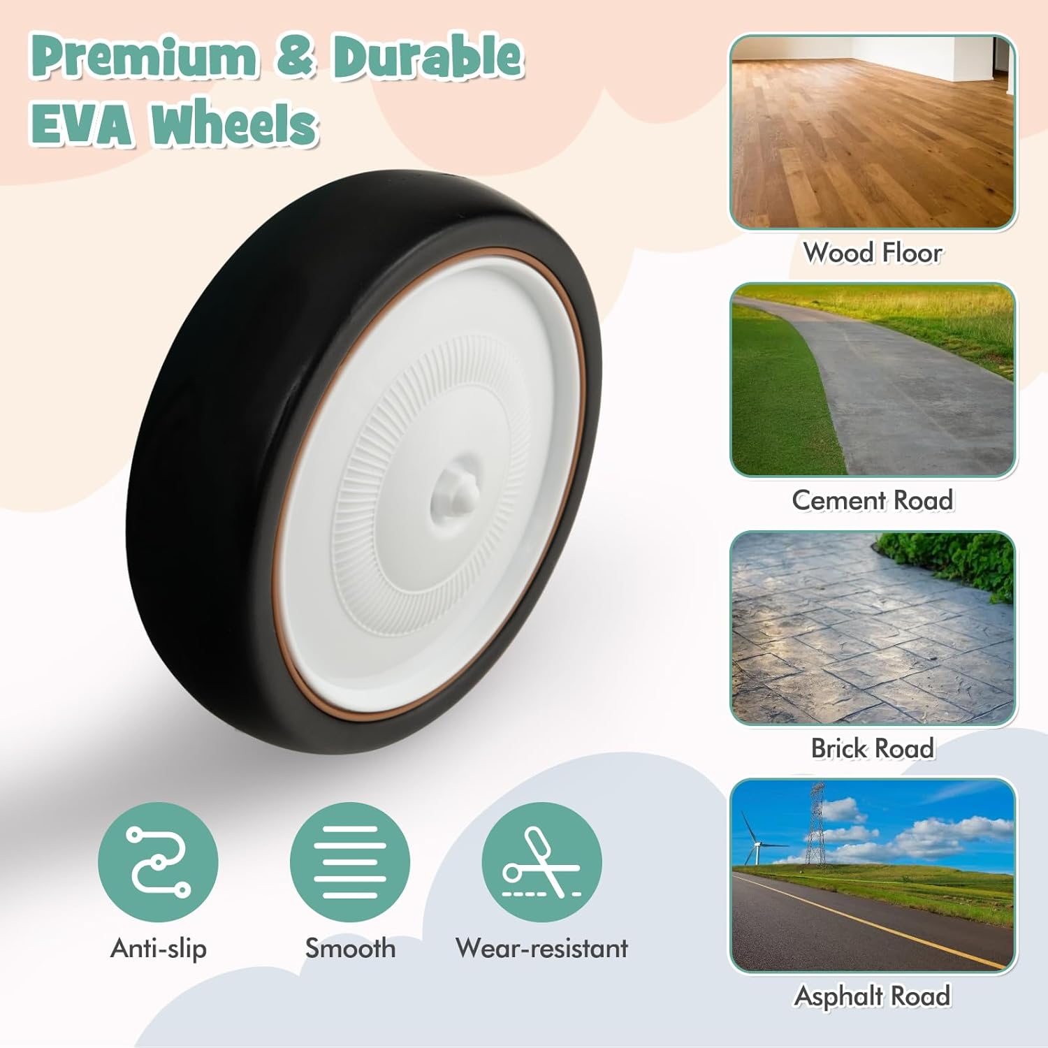 - 【Premium & Durable Wheels】Equipped with 4 all-terrain EVA wheels, the baby push walker offer superior performance. The wheels are anti-slip, wear-resistant, and shock-absorbent, ensuring smooth and safe rides on different types of surfaces such as wood floor, cement road, brick road and asphalt road.