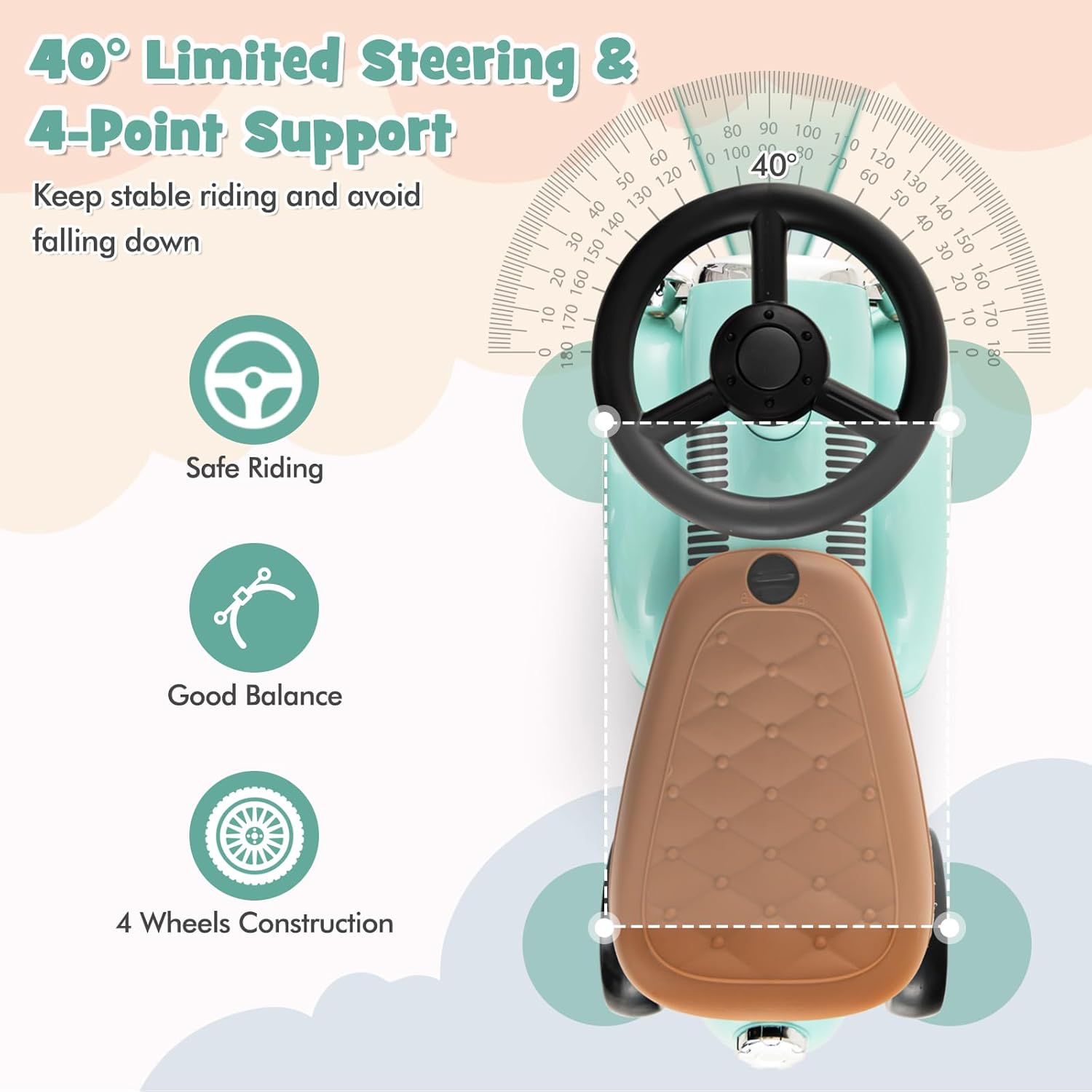 - 【40° Limited Steering & 4-Point Support】This HONEY JOY baby ride on toy comes with a 40° limited steering which helps to keep stable riding and avoid falling down. Besides, the 4 wheels construction ensures good balance and safe riding.