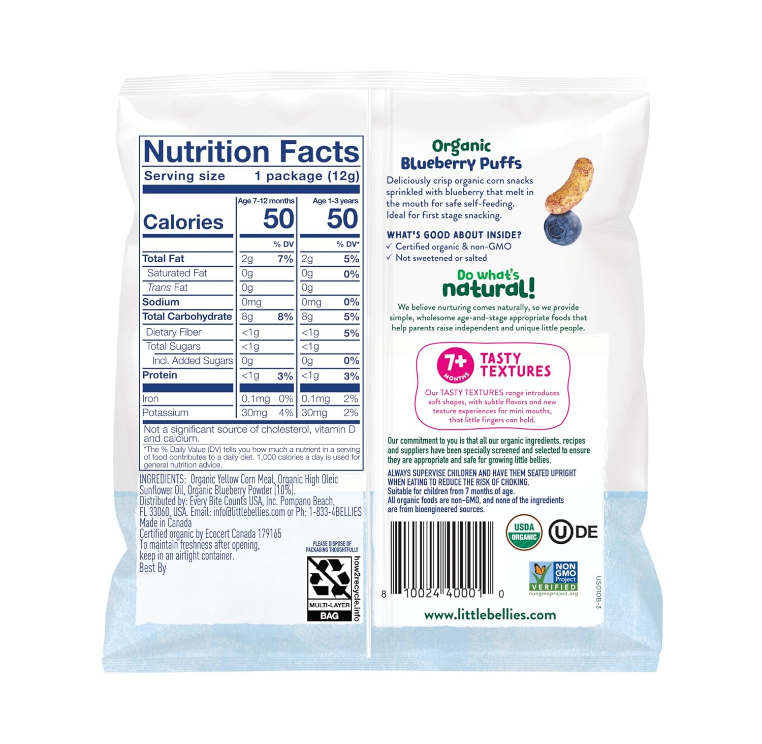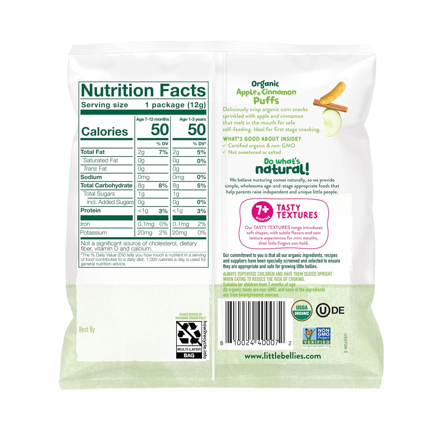 - Organic Apple and Cinnamon & Blueberry Puff Snacks: These organic soft puffed corn snacks are sprinkled with apple and cinnamon as well as blueberry, they melt easily in the mouth to encourage safe self-feeding; Suitable for children from 7 months of age