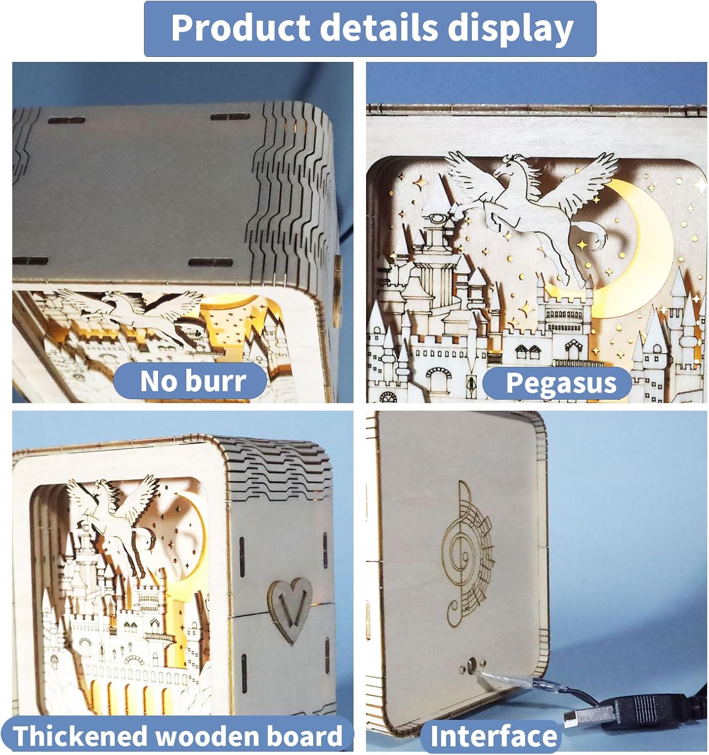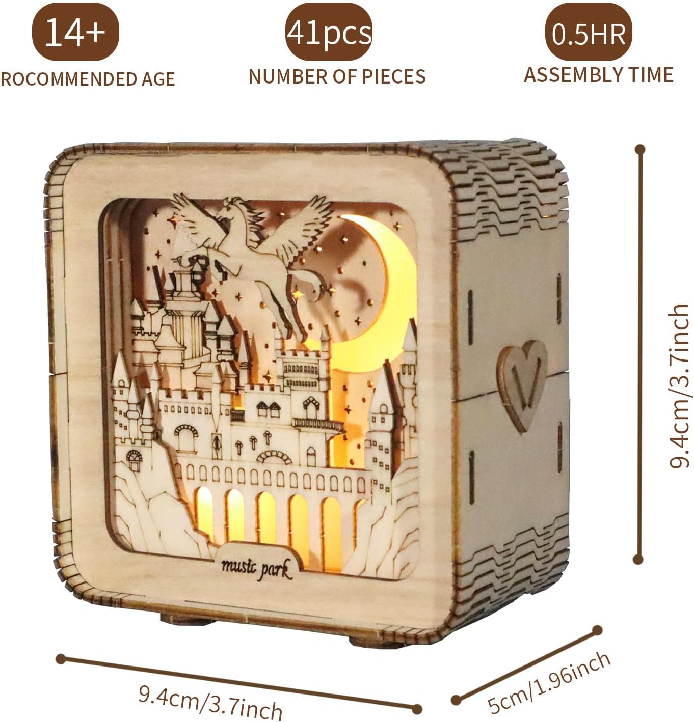 - 🏰【UNIQUE 3D WOODEN PUZZLE】This is a Pegasus Castle music box wooden puzzle, and also a small night light. Allowing handcraft enthusiasts to enjoy the fun of assembling it by themselves, an aesthetic tabletop decor for home, office, cafes, hotel, bookstore, etc.