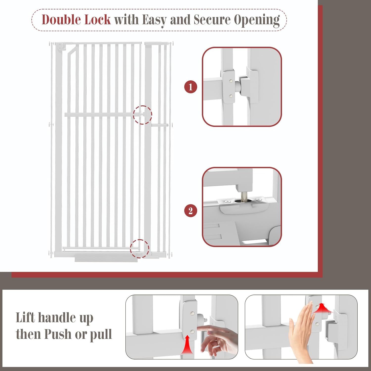 - 【Auto-close Design】The cat door lock is located in the center of the safety door, convenient for daily use. Adults can easily open the pet gate indoor with one hand, just press the button and lift the taller and wider cat gate. However, it is difficult to open for pets. In addition, the extra tall pet gate opens forward and backward and stays open at 90° and closes automatically at less than 90°. This allows you to easily walk through this cat gate indoor without having to open and close it frequently