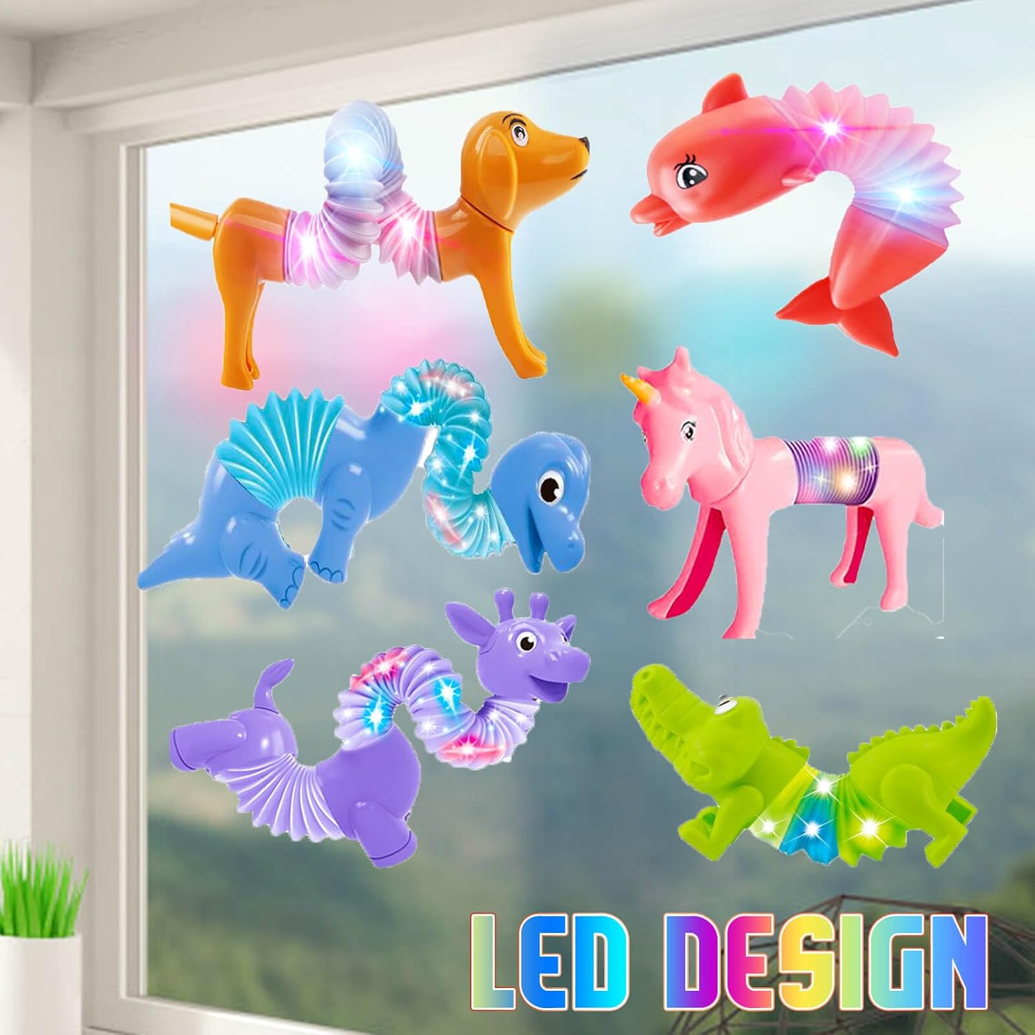 - LED Animal Pop Tubes: The sensory fidget toy set comes with LED lights,Shake it and it will flash;This pop tubes have 6 different animal shapes including long-necked dinosaurs, giraffes, unicorn, dogs, dolphins and crocodiles