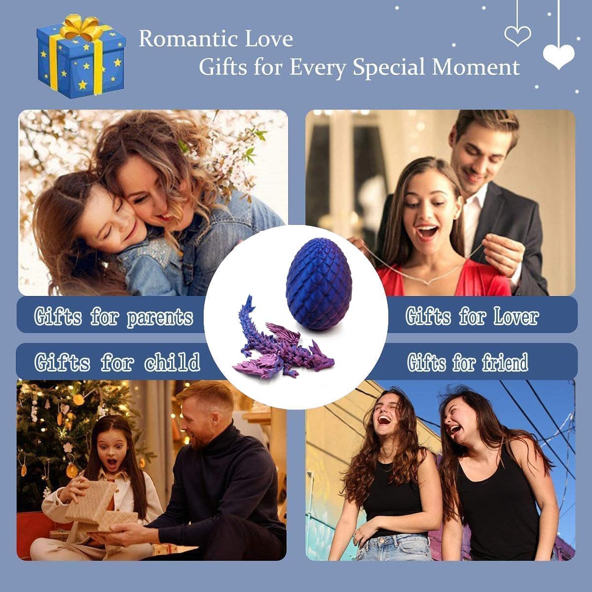 3D Printed Dragon with Wings, 3D Printed Dragon Eggs with Dragon Inside, Dragon Fidget Toy, Articulated Crystal Dragon in Egg, Home Office Decor(Purple)