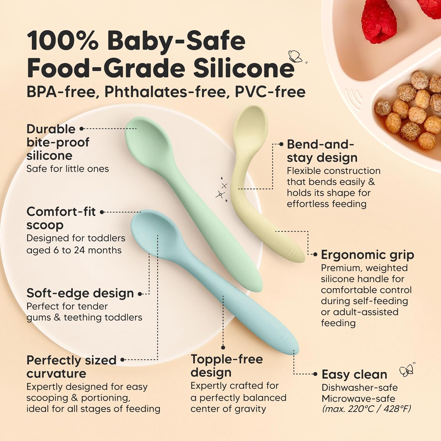 - Safer Silicone - KeaBabies 3-Pack Prep Silicone Baby Spoons Set is made from 100% food-grade, BPA-free silicone. With a topple-free handle and comfort sized scoop, these toddler spoons help BLW toddlers build confidence as they learn self-feeding.