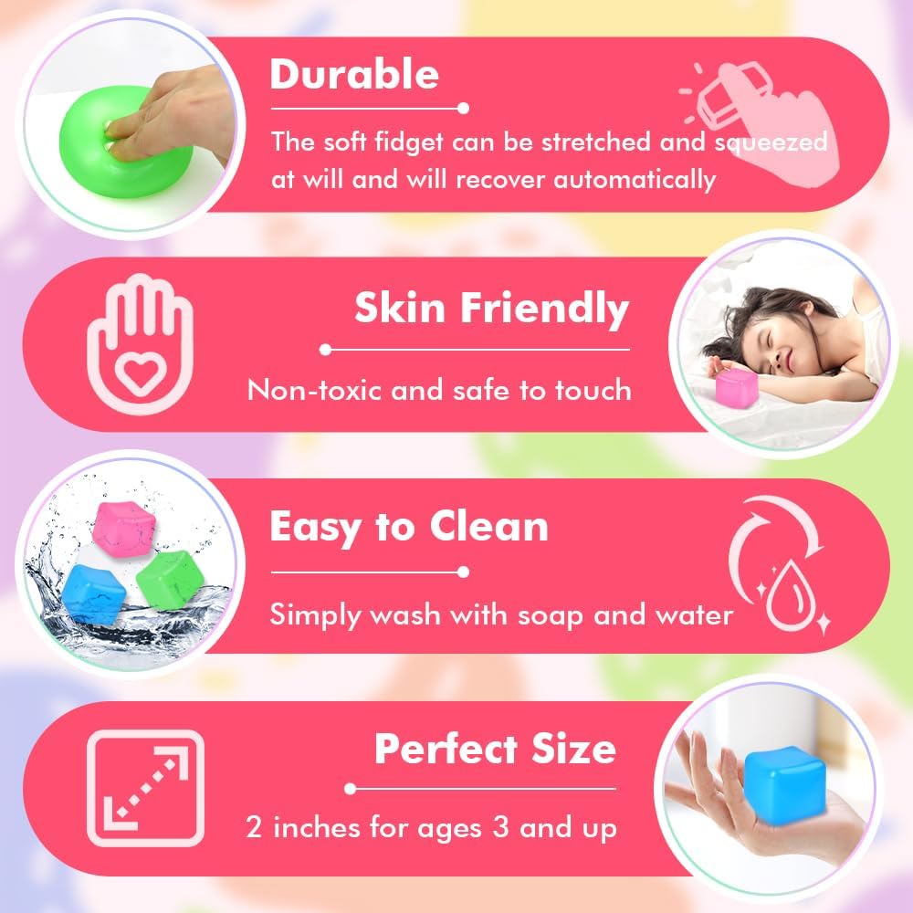 - Cube Fidget Toy: Vibrant cubes provide a sense of calm and serenity for the ultimate relaxing experience. These soft cubes provide a soothing tactile experience, perfect for those who need to release stress
